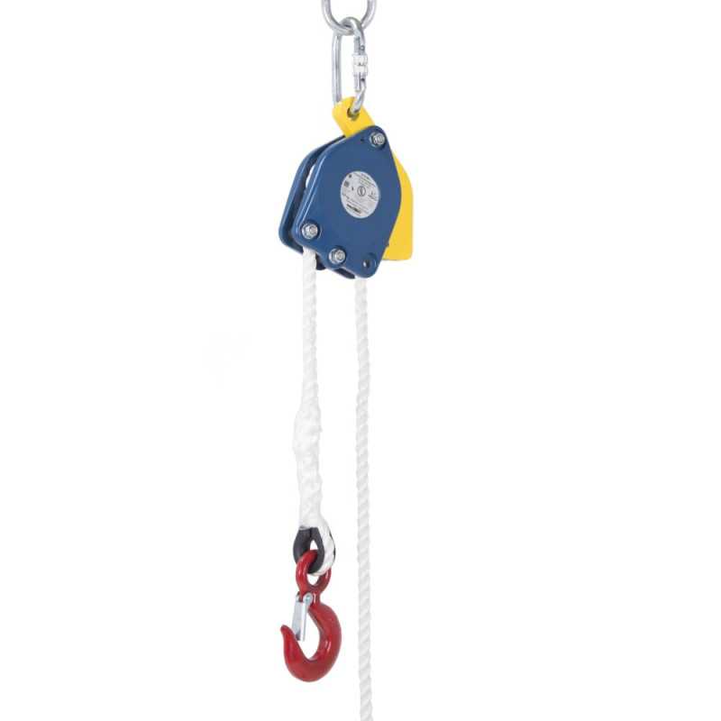 Bloczek z automatycznym hamulcem i liną o długości 20 m do ewakuacji i asekuracji pionowej. Obudowa z tworzywa i metalu, stalowa lina galwanizowana, system natychmiastowej blokady w razie upadku.