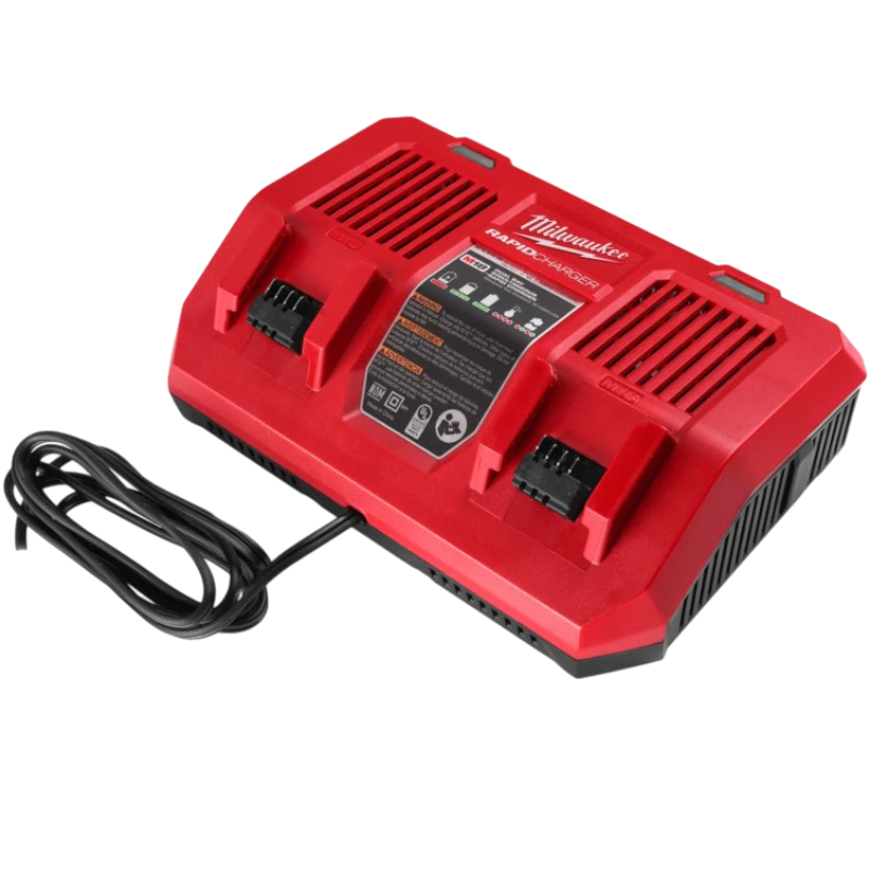 Podwójna ładowarka z serii M18 o zwiększonej wydajności, umożliwiająca równoczesne i szybkie ładowanie dwóch akumulatorów litowo-jonowych Milwaukee 18 V. Kompatybilna z wieloma pojemnościami akumulatorów.