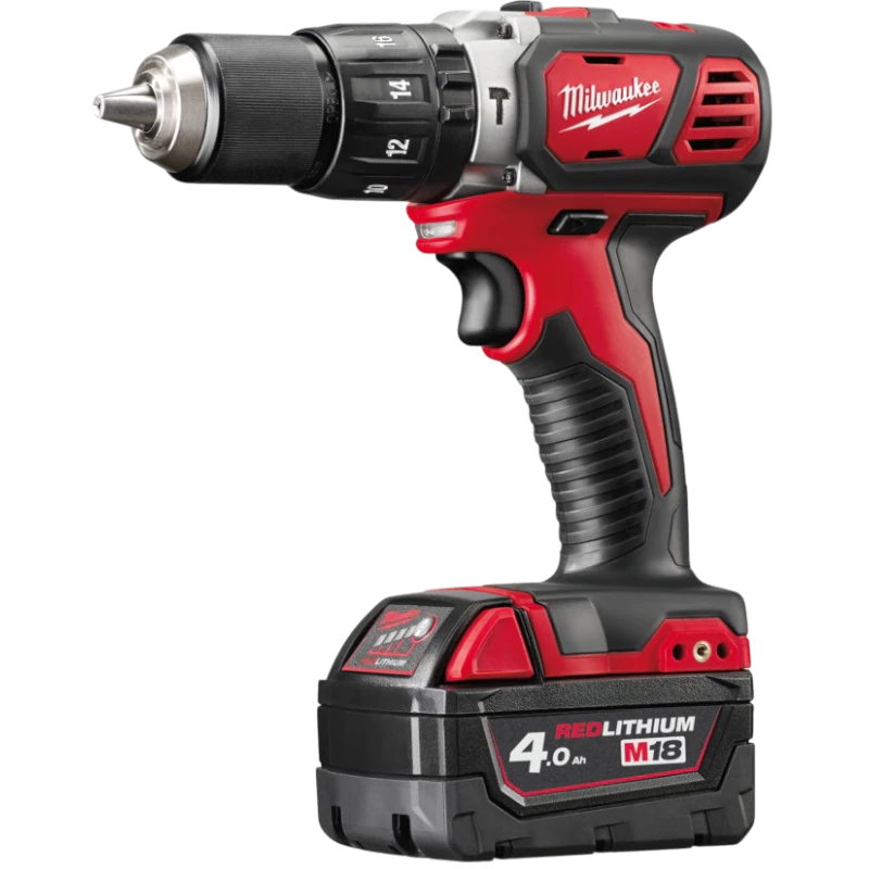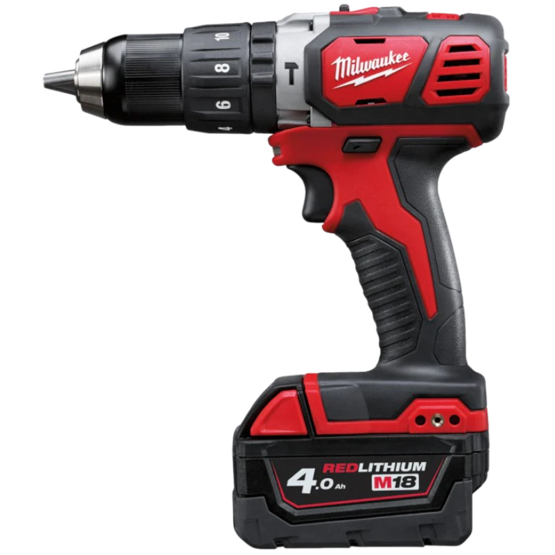 Milwaukee M18 BPD-402C to kompaktowa wiertarko-wkrętarka udarowa 18 V, sprzedawana jako kompletny zestaw zawierający dwa akumulatory REDLITHIUM-ION 4.0 Ah, ładowarkę oraz wytrzymałą walizkę transportową. Narzędzie jest wyposażone w metalowy uchwyt 13 mm, dwubiegową przekładnię oraz oświetlenie LED, co umożliwia pracę w słabo oświetlonych miejscach. System REDLINK chroni urządzenie przed przeciążeniem, a wskaźnik poziomu naładowania pozwala użytkownikowi kontrolować stan akumulatorów podczas pracy.
