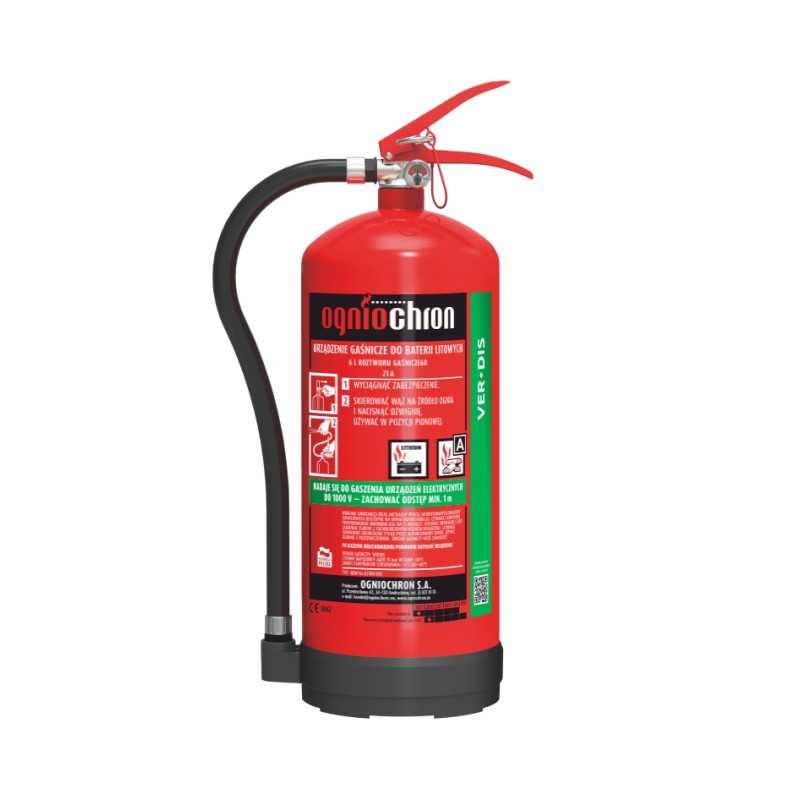 VER-DIS 6x to specjalistyczne urządzenie gaśnicze do baterii litowo-jonowych o zwiększonej pojemności 6 litrów, przeznaczone do gaszenia i chłodzenia akumulatorów Li-ion. Zawiera innowacyjny środek gaśniczy VERDIS, którego zadaniem jest szybkie obniżenie temperatury baterii oraz skuteczne ugaszenie płomieni. Urządzenie zaprojektowano z myślą o reagowaniu na zjawisko ucieczki termicznej, które może prowadzić do gwałtownego rozwoju pożaru w pakietach akumulatorowych.