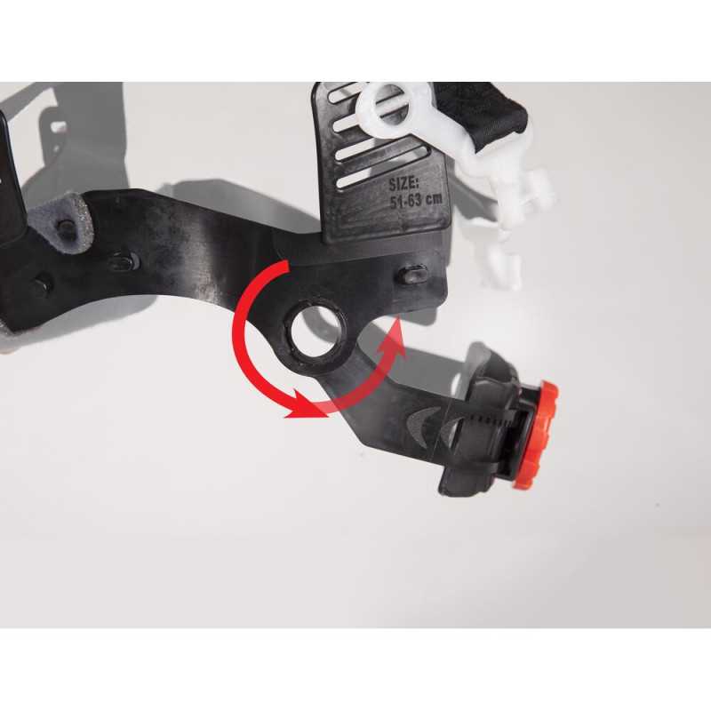 Wyposażony w więźbę obrotową z pokrętłem, umożliwia szybkie i precyzyjne dopasowanie obwodu. Zastosowane uniwersalne gniazda 30 mm pozwalają na montaż dodatkowych akcesoriów, takich jak ochronniki słuchu, osłony twarzy czy latarki.