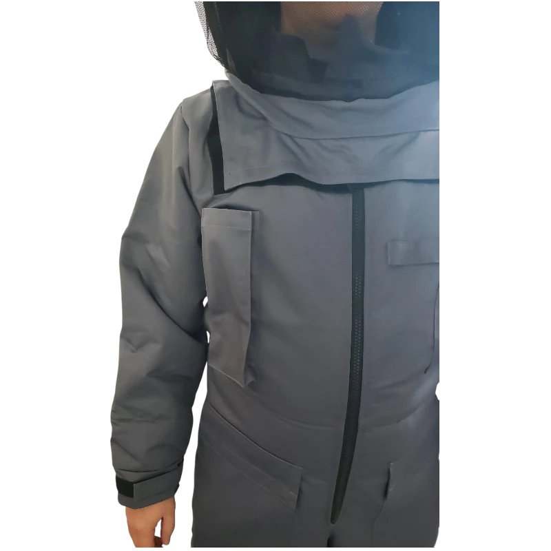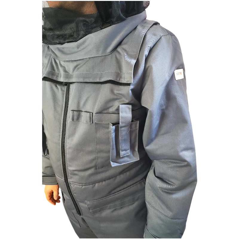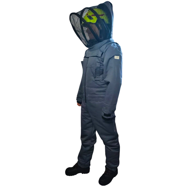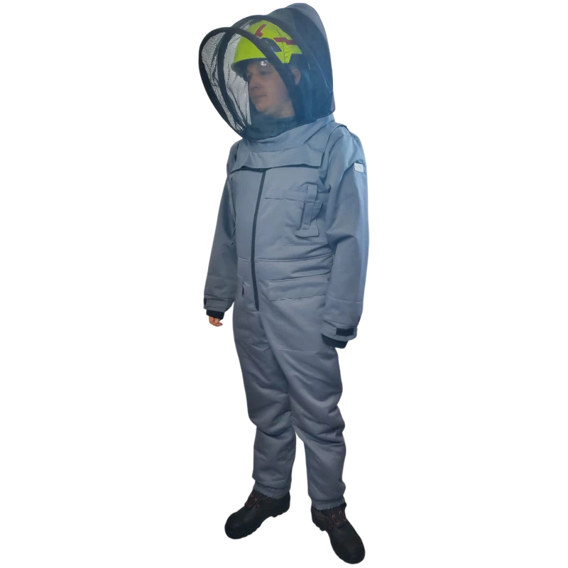 Profesjonalny kombinezon ochronny przeznaczony do zabezpieczenia przed ukąszeniami szerszeni i os, wykonany z trzech warstw materiału. Wyposażony w kaptur przypinany suwakiem, ściągacze na rękawach i nogawkach oraz dodatkowe uszczelnienia, zapewniający pełną ochronę i komfort użytkowania.