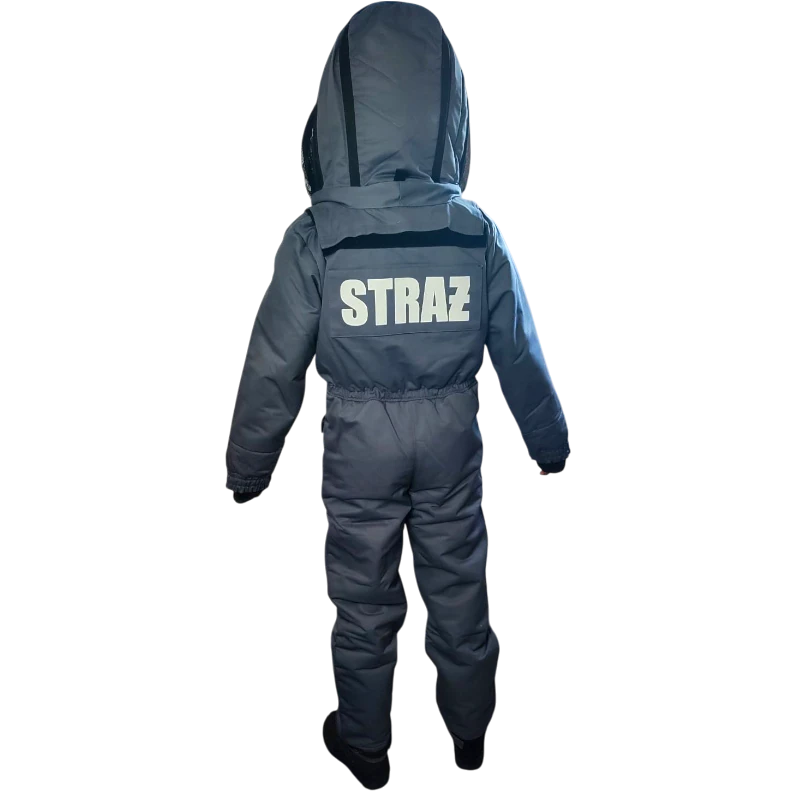 Kombinezon ochronny na szerszenie to specjalistyczne ubranie zaprojektowane w celu zapewnienia pełnej ochrony przed ukąszeniami owadów błonkoskrzydłych, takich jak szerszenie, osy i pszczoły. Wykonany z trzech warstw materiału, kombinezon składa się z dwóch warstw tkaniny oraz warstwy pianki poliuretanowej o grubości 5 mm, która izoluje ciało użytkownika od kontaktu z żądłami owadów. Kombinezon wyposażony jest w kaptur przypinany suwakiem, co umożliwia pracę w hełmie strażackim, oraz posiada ściągacze na rękawach i nogawkach, które dodatkowo zabezpieczają przed dostaniem się owadów do wnętrza kombinezonu.
