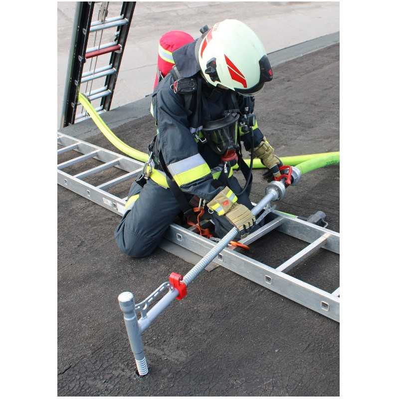 Zestaw lanca gaśnicza przebijająca do dachów MKD 35 - 1000 - A z młotem 4kg to specjalistyczne narzędzie przeznaczone do szybkiego i skutecznego gaszenia pożarów ukrytych, zwłaszcza w przestrzeniach międzystropowych oraz pod pokryciem dachowym. Lanca MKD 35-1000-A została zaprojektowana w taki sposób, by umożliwiać przebicie pokryć dachowych i aplikację środka gaśniczego bez konieczności wchodzenia do wnętrza budynku. W zestawie znajduje się także młot o masie 4 kg, który ułatwia przebicie twardych materiałów, takich jak blacha, papa czy drewno. Całość jest przystosowana do intensywnego użytkowania w działaniach operacyjnych jednostek straży pożarnej.