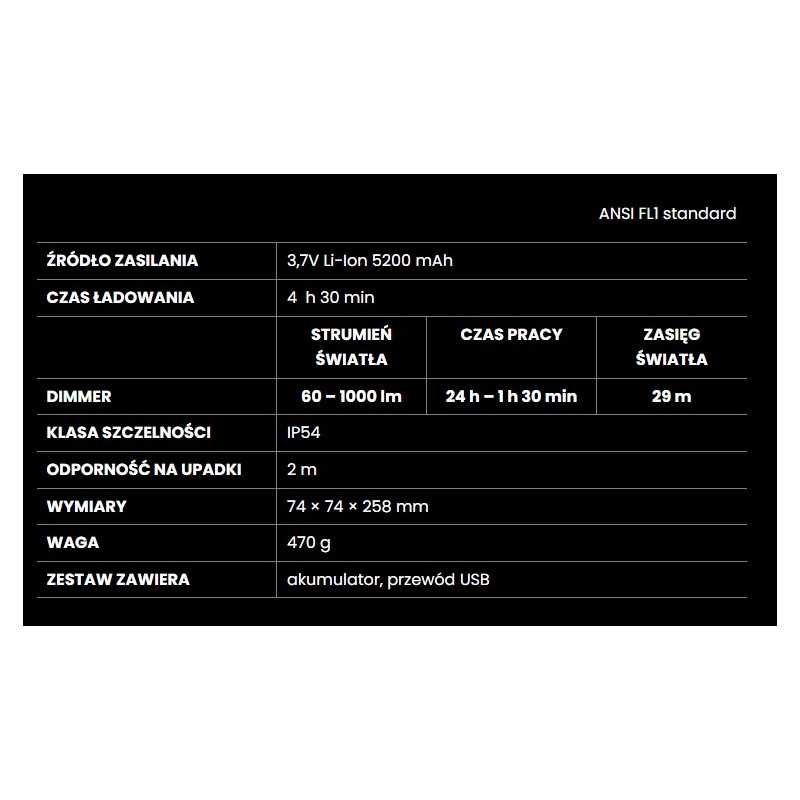 Lampa jest wyposażona w akumulator Li-Ion o pojemności 5200 mAh, który zapewnia długi czas pracy bez konieczności częstego ładowania. Proces ładowania trwa 4,5 godziny i odbywa się za pośrednictwem portu Micro USB. Wskaźnik naładowania baterii, umieszczony w rękojeści, pozwala na szybkie sprawdzenie poziomu energii, co minimalizuje ryzyko nagłego rozładowania.