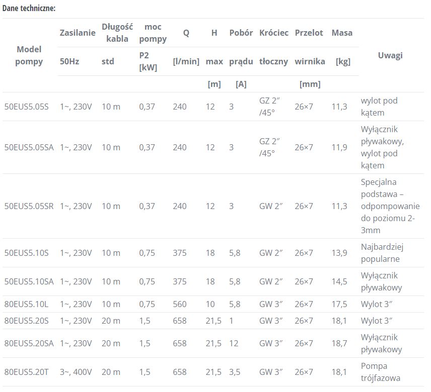 Możliwość pracy ciągłej (silnik klasy S1, 230V, IP 68, 50Hz, 2850 RPM).
