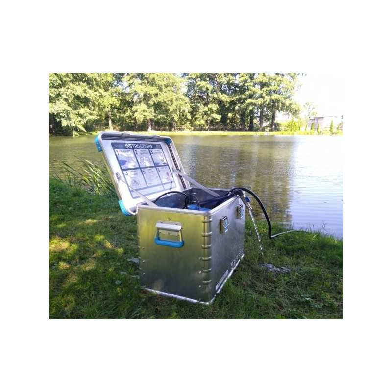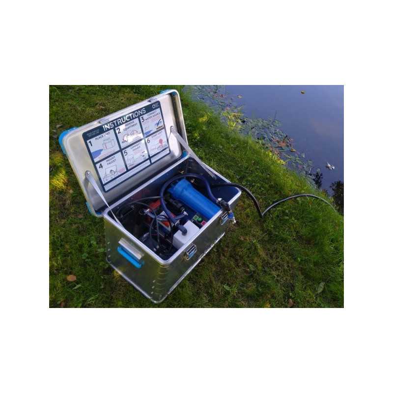 Mobilny zestaw do awaryjnego uzdatniania wody przeznaczony do szybkiego działania w sytuacjach kryzysowych. Wydajność 600–900 l/h, zasilanie z akumulatora i panelu solarnego. Zestaw zawiera: moduł filtracyjny, akumulator, panel fotowoltaiczny, przewody, zestaw filtrów, wąż ssawny, zestaw transportowy.