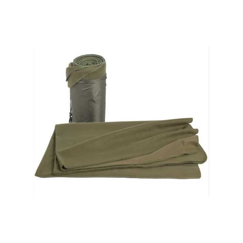 Kompaktowy i ciepły koc polarowy w kolorze zielonym z praktyczną torbą transportową, idealny do użytku w terenie. W zestawie: