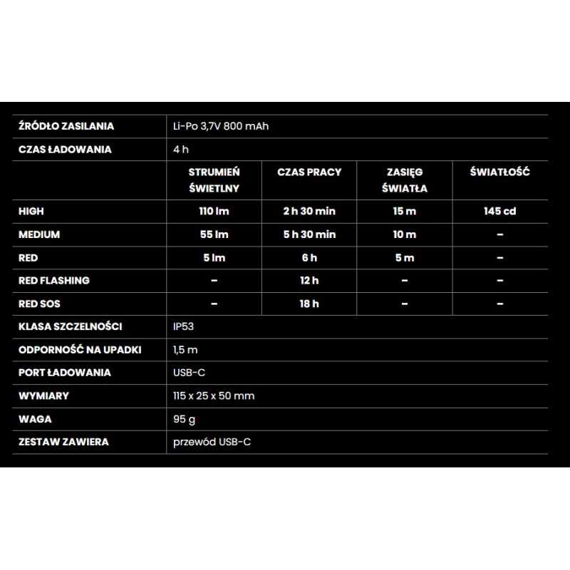 Latarka jest wyposażona w akumulator litowo-jonowy o pojemności 800 mAh, który ładowany jest przez port USB-C. To nowoczesne rozwiązanie gwarantuje szybkie i wygodne ładowanie, eliminując konieczność wymiany baterii i zapewniając nieprzerwaną gotowość do pracy.