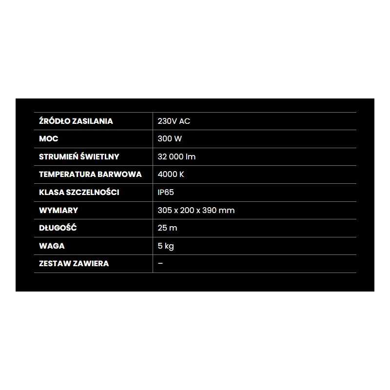 Wąż świetlny LED o mocy 32 000 lumenów zapewniający intensywne i równomierne oświetlenie na dużej powierzchni. Odporna na wodę i pył konstrukcja pozwala na pracę w trudnych warunkach. Idealny do zastosowań budowlanych, przemysłowych i ratowniczych. W zestawie: wąż świetlny, przewód zasilający.