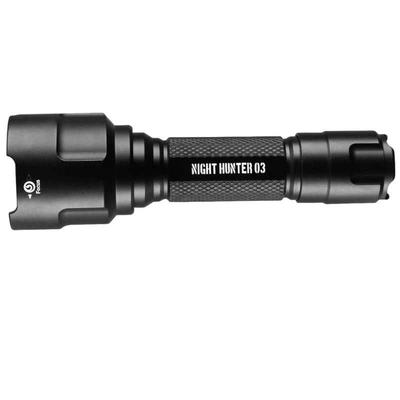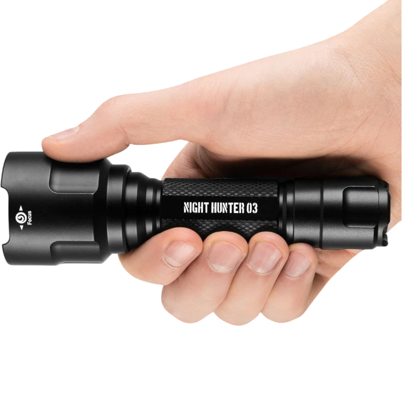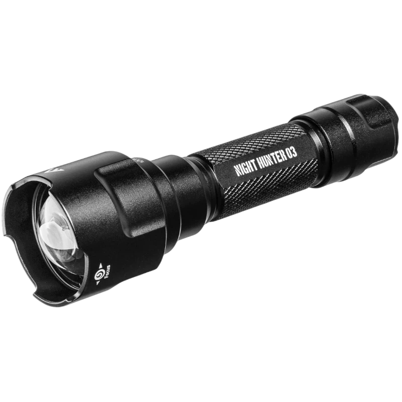 Night Hunter 03 to kolejna latarka z popularnej serii stworzonej z myślą o profesjonalistach poszukujących godnego zaufania światła ręcznego lub montowanego do broni. Produkt wykonano z aluminium lotniczego. Mocą 1150 lumenów oślepi każdego przeciwnika. Dzięki funkcji Focus (regulacja szerokości wiązki światła) oświetli drogę nawet na odległość 391 m. Zastosowanie dużej średnicy lustra wraz z soczewką powoduje, że wiązka nawet w maksymalnej szerokości zachowuje intensywność, pomagając tym samym wyłonić w przeszukiwanym obszarze pożądane szczegóły lub obiekty. Powyższa charakterystyka czyni Night Hunter 03 ulubioną latarką straży granicznej oraz myśliwych. Produkt może być zasilany zamiennie dwiema bateriami CR123 lub akumulatorem 18650.
