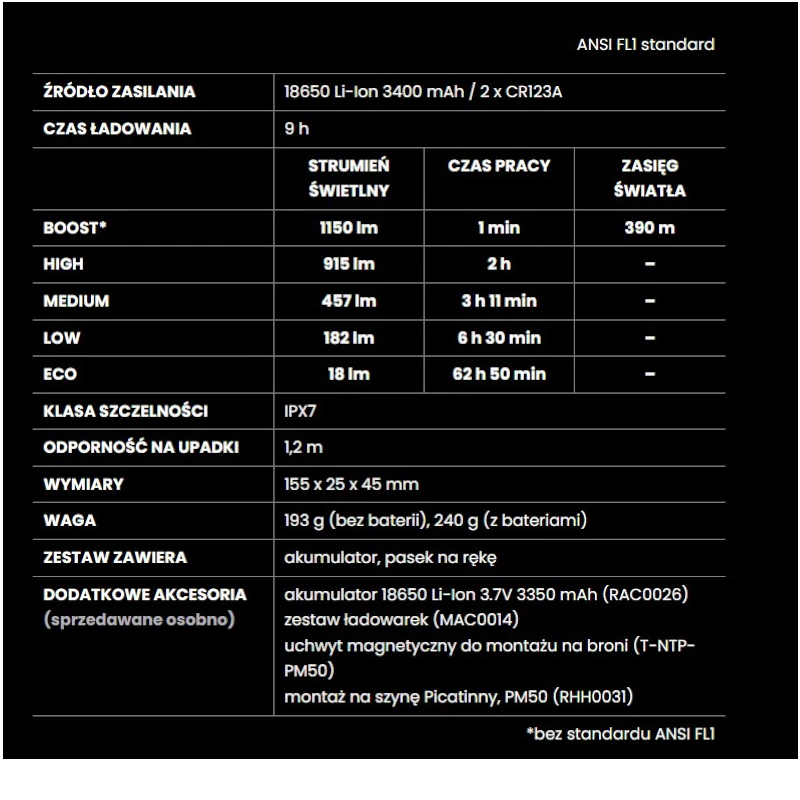 - Zestaw zawiera: latarka, akumulator 18650, 3,7 V 3400 mAh, ładowarka, pasek na rękę, pudełko