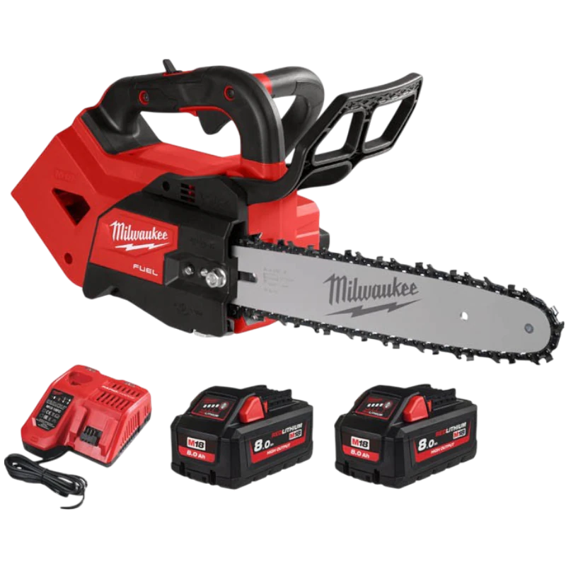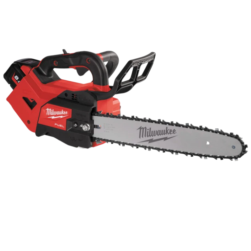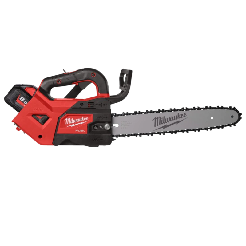Profesjonalna pilarka akumulatorowa z górnym uchwytem i prowadnicą 35 cm, zaprojektowana z myślą o pracach na wysokości i w trudno dostępnych miejscach. W zestawie: piła, 2 akumulatory M18™ 8.0 Ah, szybka ładowarka oraz walizka transportowa HD BOX.