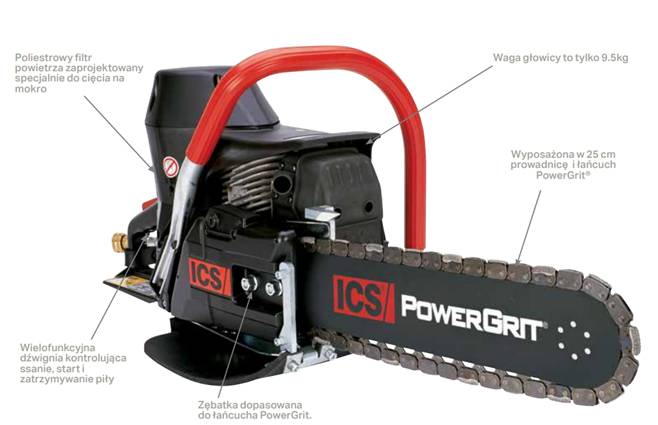 Oferowany zestaw startowy zawiera: maszynę ICS-680 +prowadnicę ICS-35 cm +łańcuch diamentowy z serii ICS-FORCE3 o długości 35 cm