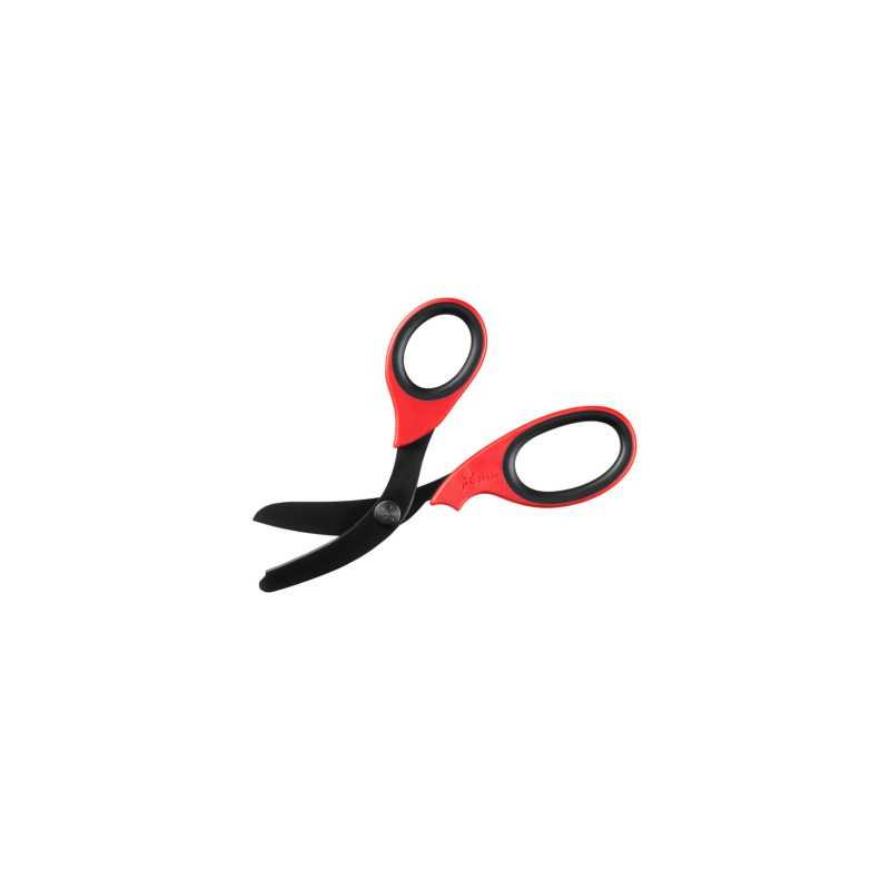 Nożyczki ratownicze do zadań specjalnych w intensywnym kolorze czerwonym, przystosowane do cięcia pasów, ubrań ochronnych i materiałów technicznych. Wytrzymała konstrukcja i uchwyt z antypoślizgową gumą.