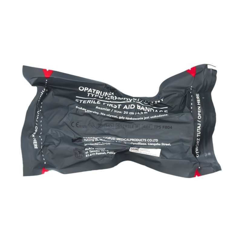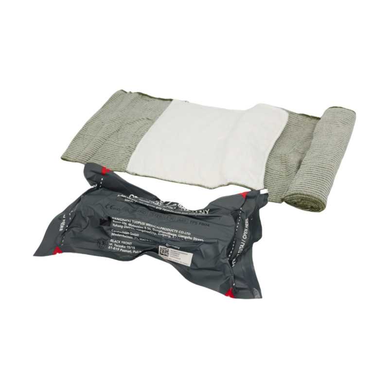 Taktyczny opatrunek indywidualny z kompresją o szerokości 20 cm, wyposażony w element dociskowy do skutecznego tamowania masywnych krwotoków. Sprawdza się w działaniach ratowniczych i taktycznych.