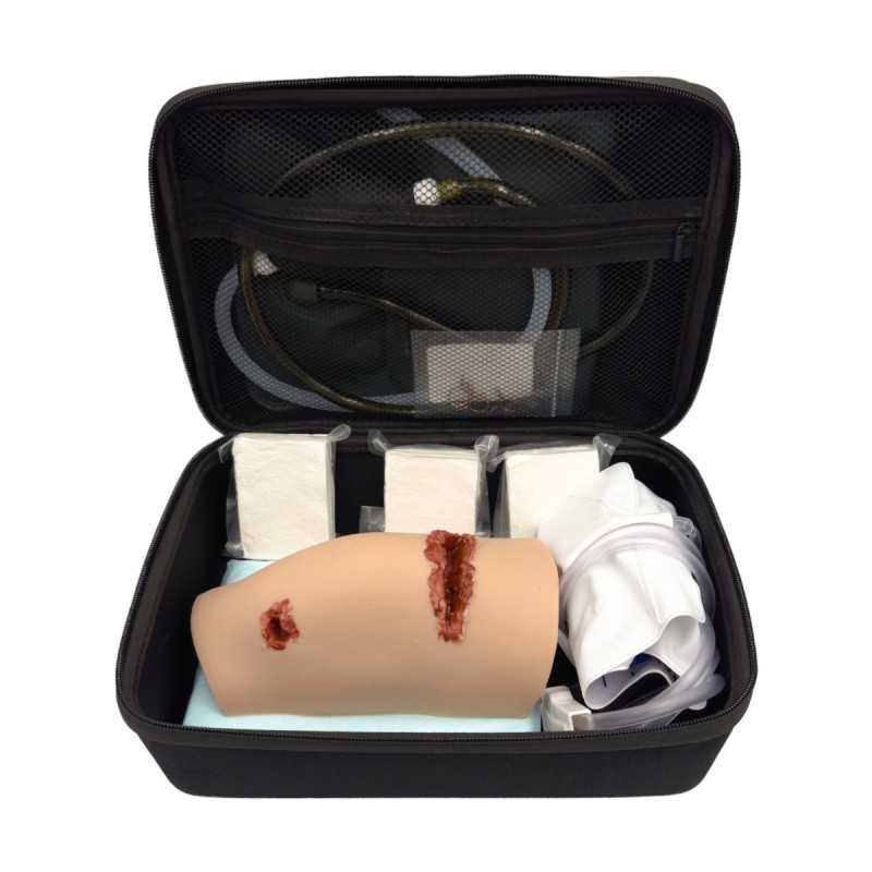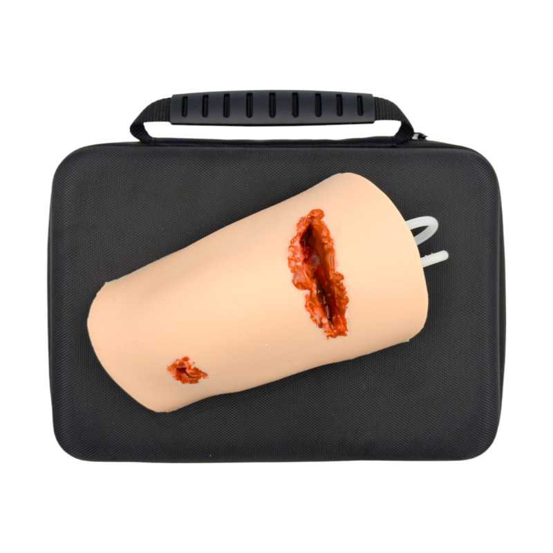 Realistyczny trenażer ran ciętych i kłutych, umożliwiający ćwiczenie tamowania krwotoków z wykorzystaniem opatrunków, gazików i ucisku bezpośredniego. Wspiera szkolenia z zakresu medycyny pola walki i KPP.