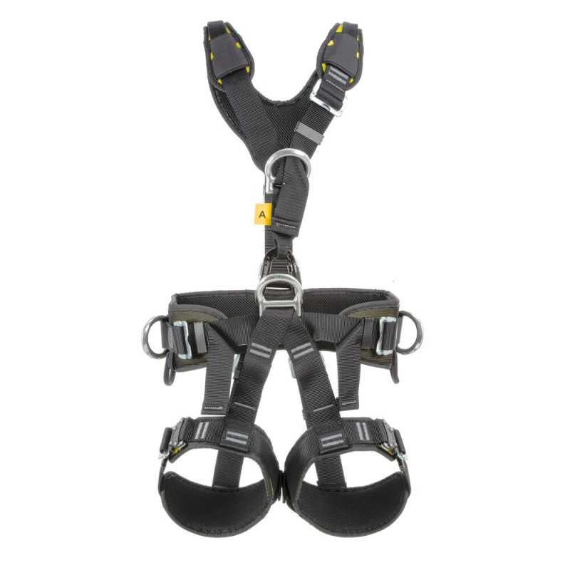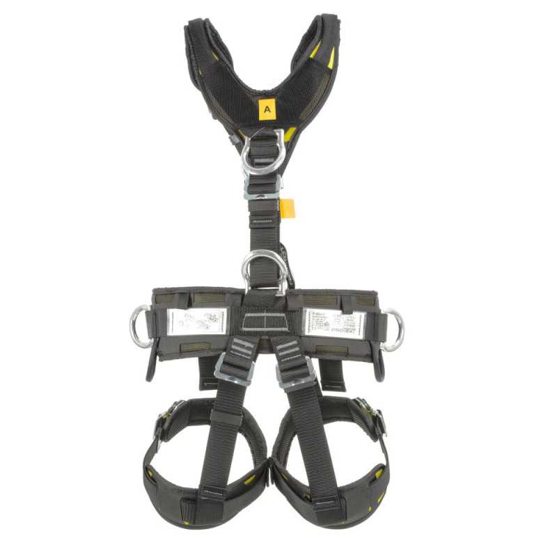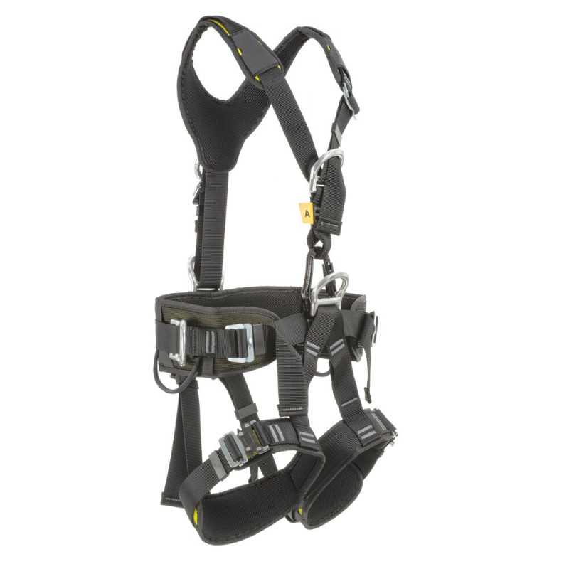 Szelki asekuracyjne do intensywnej pracy na wysokości, wyposażone w punkty zaczepowe z przodu i tyłu, pas biodrowy oraz boczne D-ringi. Regulowane taśmy zapewniają dopasowanie i komfort użytkowania.