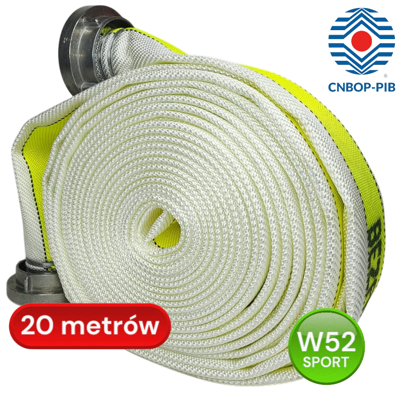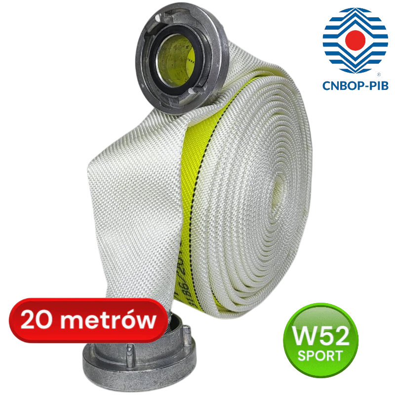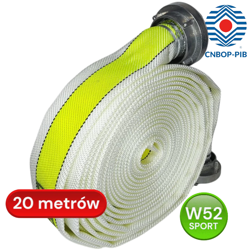 Biało-żółty luminescencyjny wąż sportowy S 52, przeznaczony do zawodów pożarniczych i ćwiczeń strażackich. Wykonany z lekkiego materiału z wkładką poliuretanową, zapewnia wysoką wytrzymałość i elastyczność. Certyfikowany przez CNBOP, odporny na ścieranie i czynniki atmosferyczne.