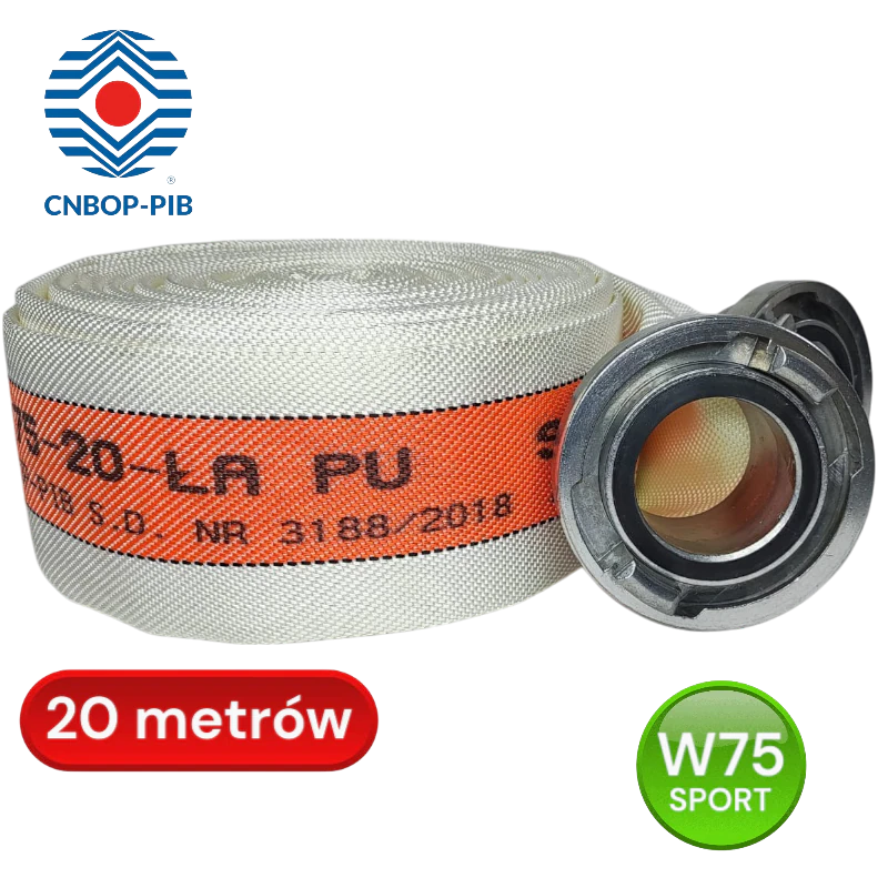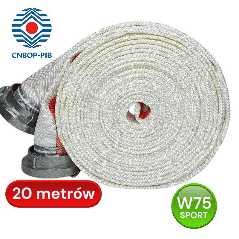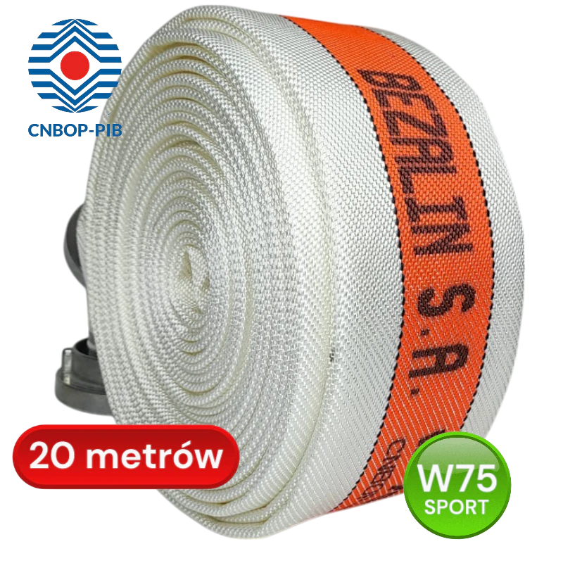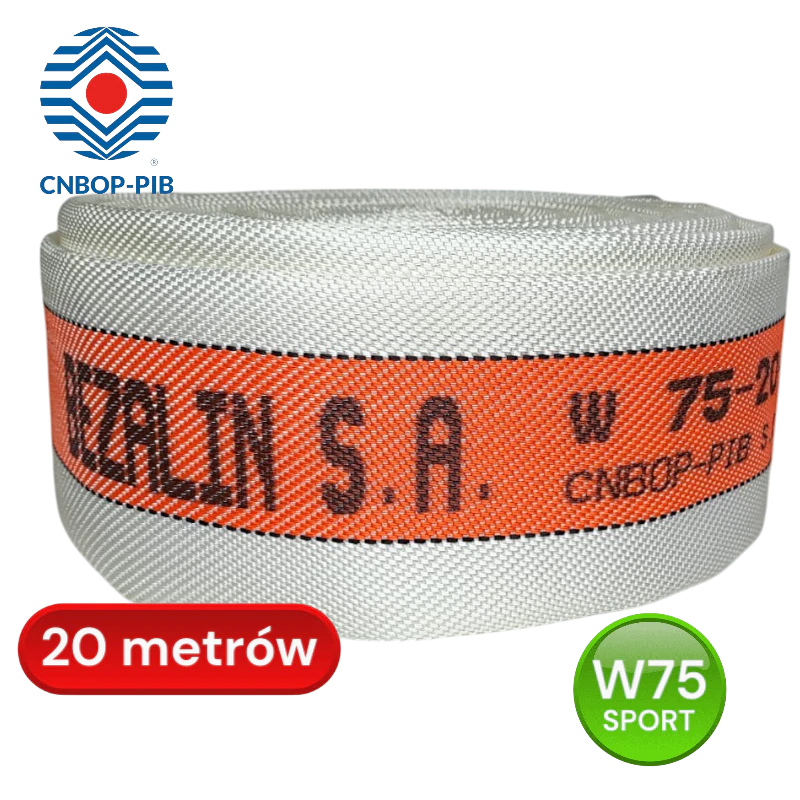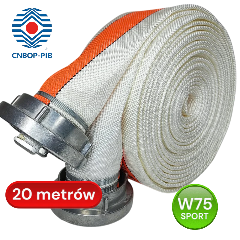 Biało-pomarańczowy luminescencyjny wąż sportowy S 75 o długości 20 metrów, przeznaczony do zawodów pożarniczych i ćwiczeń strażackich. Wyposażony we wkładkę poliuretanową, zapewnia wysoką elastyczność i trwałość. Certyfikowany przez CNBOP, odporny na ścieranie i czynniki atmosferyczne.