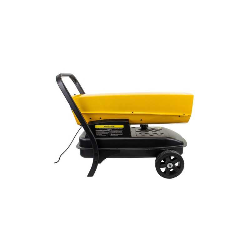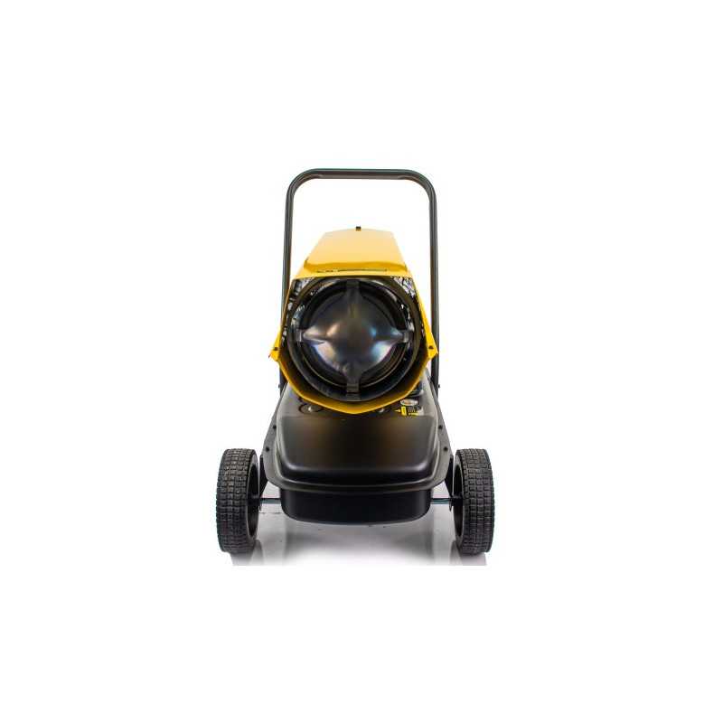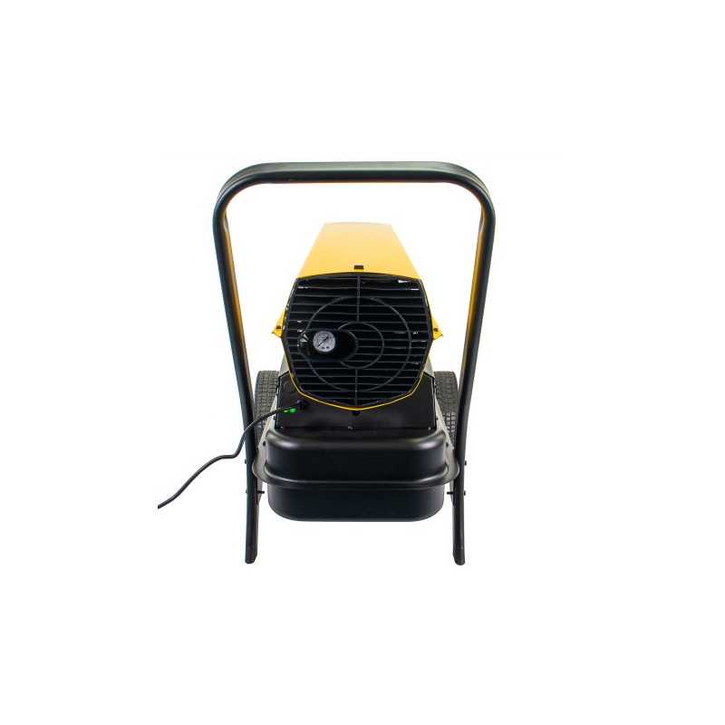 Mobilna nagrzewnica olejowa o mocy 37 kW z elektronicznym zapłonem, termostatem, 38-litrowym zbiornikiem paliwa i zabezpieczeniem przed przegrzaniem. Wyposażona w czujnik płomienia, stalową obudowę i kółka transportowe.