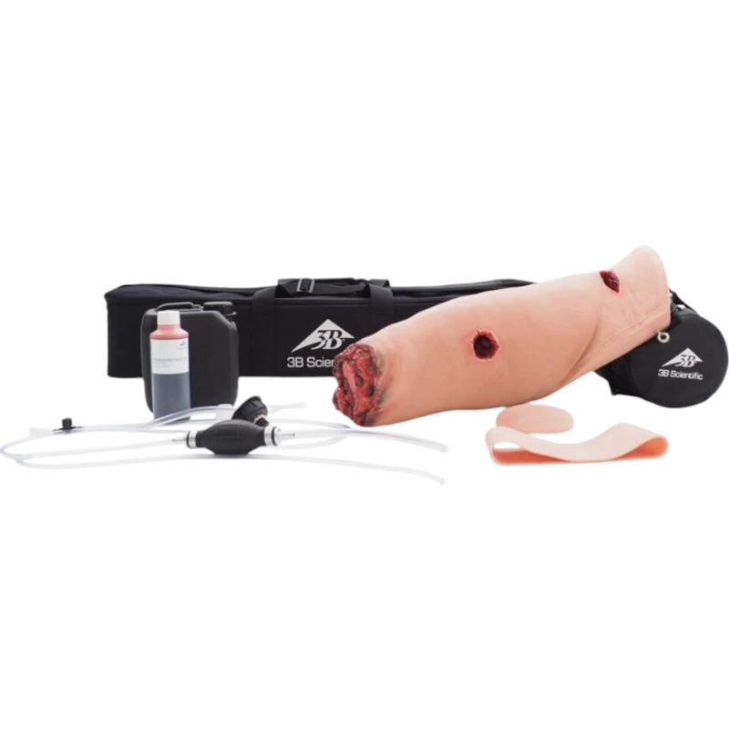 Trenażer przeznaczony jest do celów szkoleniowych i nie zastępuje rzeczywistej interwencji medycznej. Nie symuluje pełnego zakresu urazów, takich jak złamania czy uszkodzenia nerwów. Aby zachować trwałość modelu, wymaga regularnej konserwacji i czyszczenia. Nie jest przeznaczony do stosowania w warunkach rzeczywistego zagrożenia życia.