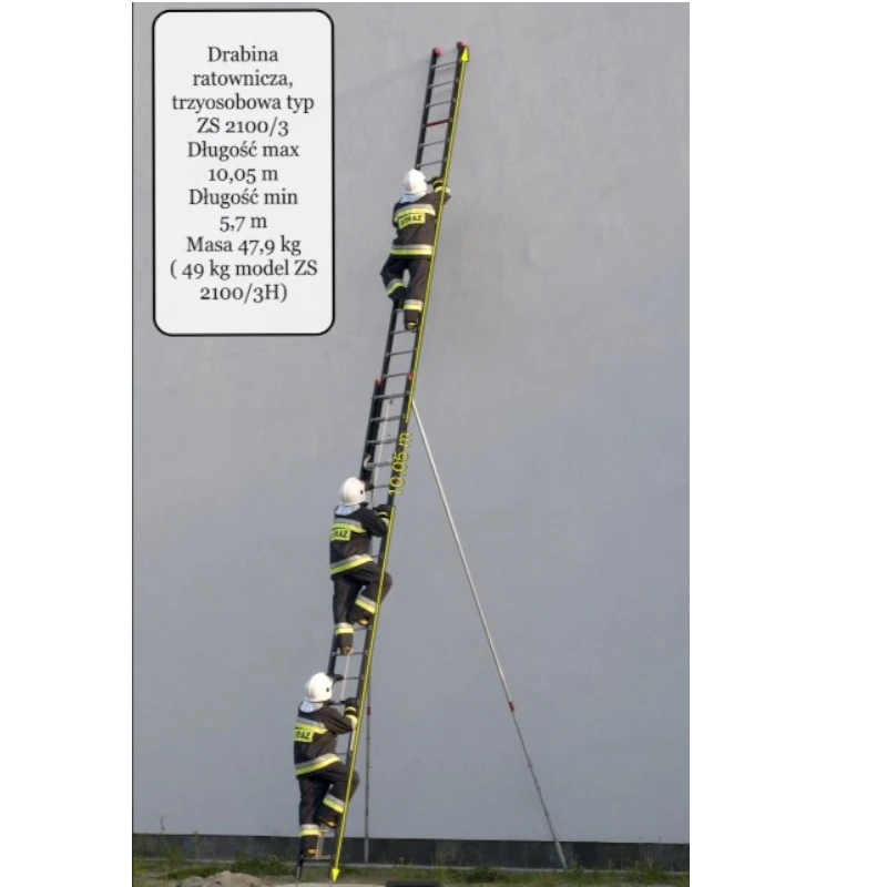 Trzyosobowa drabina, dwuprzęsłowa, wysuwana liną, wyposażona w aluminiowe drążki podporowe TYP ZS. Przęsła drabiny złożonej są wsunięte jedno w drugie, przez co stanowią bardzo mocną konstrukcję do wykorzystania w ratownictwie. Drabiny typ ZS mogą być wyposażone w dodatkowy hamulec liny - model H. Bocznice drabiny wykonane z wysokogatunkowego stopu aluminium, o profilu dwuteowym. Mają kolor czarny, co w przypadku używania drabiny w zimie ma istotne znaczenie, ponieważ są one “cieplejsze” o ok. 40% od bocznic w kolorze aluminium. Szczeble o unikalnym przekroju w kształcie litery D wskazują prawidłowy kąt ustawienia drabiny oraz dają bezpieczną, poziomą, antypoślizgową, płaszczyznę do stania o szerokości 45mm. Otwarty, dwuteowy profil bocznicy oraz opatentowany system mocowania szczebli stanowią o lekkości i wytrzymałości drabiny oraz umożliwiają udzielenie 10-cio letniej gwarancji na konstrukcję, zastosowane materiały i wykonanie wyrobu.