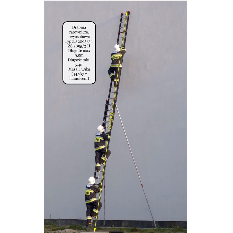 Dwuczęściowa drabina ratownicza z hamulcem liny, przeznaczona dla trzech osób, wykonana z aluminium, wyposażona w wsporniki boczne typu D10W. Model ZS 2095/3H zapewnia stabilność, bezpieczeństwo i efektywność podczas działań ratowniczych.