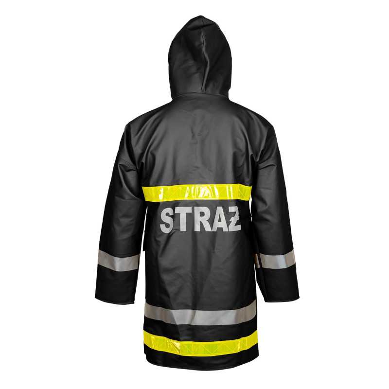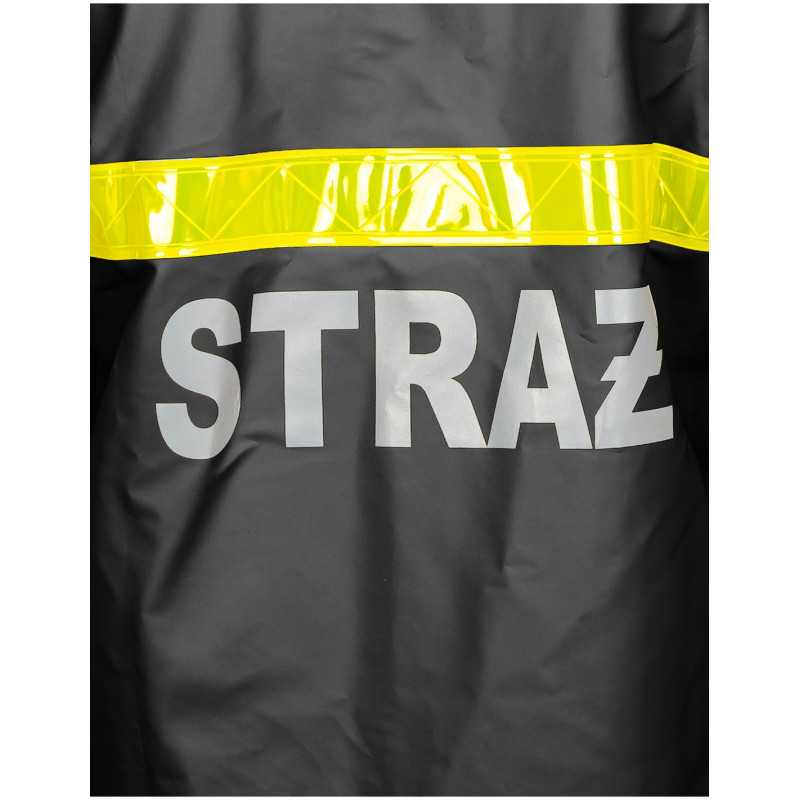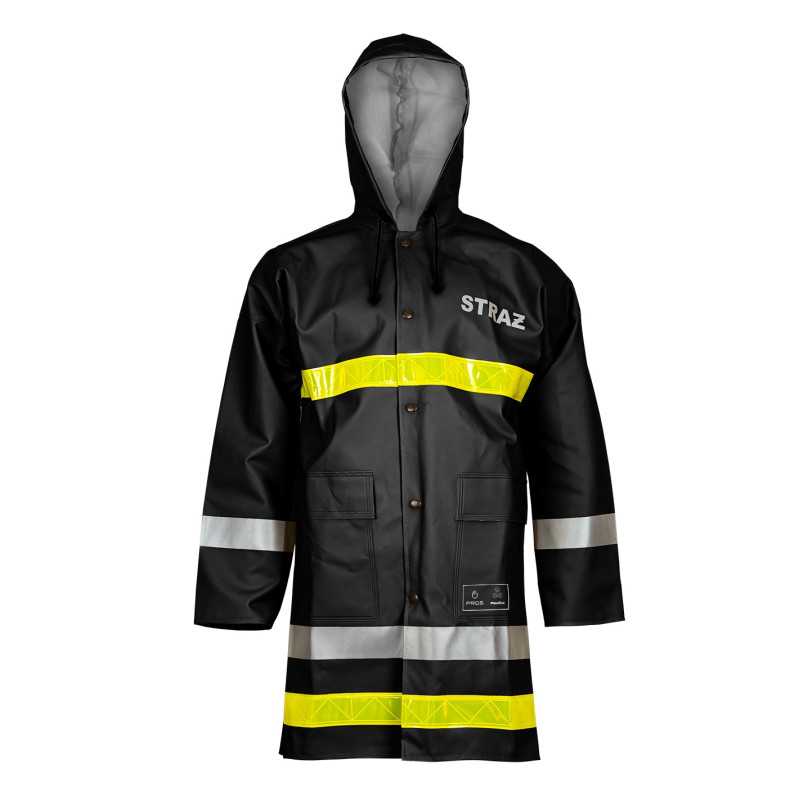 Solidna, wodoodporna kurtka ochronna dla strażaków, idealna do pracy w deszczu i wilgoci, zapewniająca widoczność i komfort użytkowania podczas akcji ratowniczych.