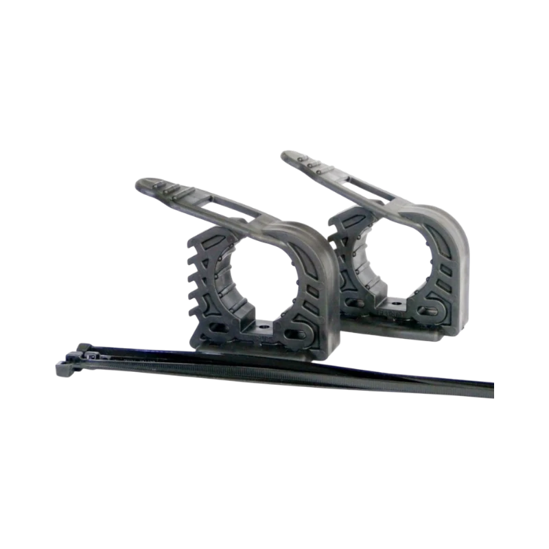 Zestaw 2 uchwytów montażowych do rur o średnicy 32–45 mm, stworzony do instalacji oświetlenia, kamer, anten i lekkiego osprzętu w pojazdach terenowych. W zestawie: 2 obejmy, śruby montażowe, zaciski.
