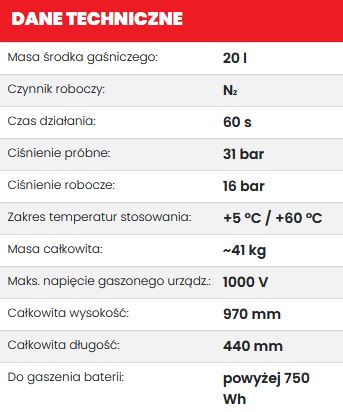 Profesjonalne urządzenie gaśnicze o pojemności 20 l przeznaczone do zabezpieczania dużych pakietów baterii Li-ion. Zawiera innowacyjny środek gaśniczy VERDIS o silnym działaniu chłodzącym, który skutecznie obniża temperaturę ogniw i ogranicza ryzyko ponownego zapłonu. Dedykowane do instalacji magazynowania energii i pojazdów elektrycznych.
