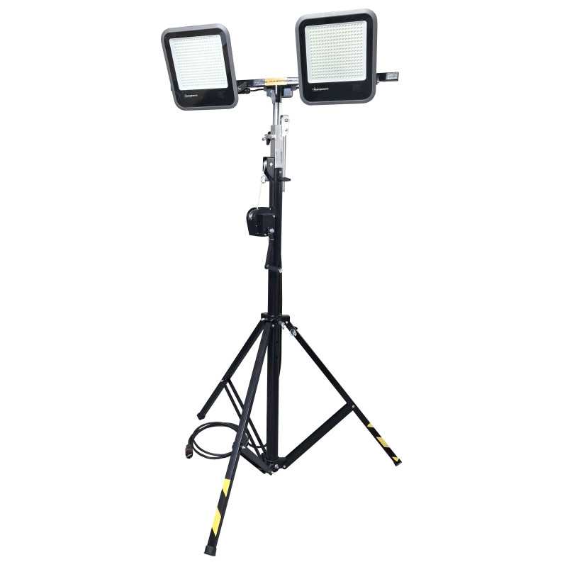 Profesjonalny maszt oświetleniowy z dwoma wydajnymi naświetlaczami LED, przeznaczony do pracy w wymagających warunkach budowlanych. Zapewnia intensywne i równomierne oświetlenie dużej powierzchni, gwarantując bezpieczeństwo i komfort pracy nawet po zmroku.