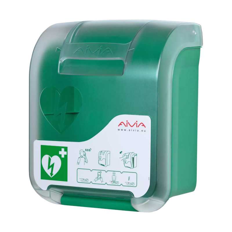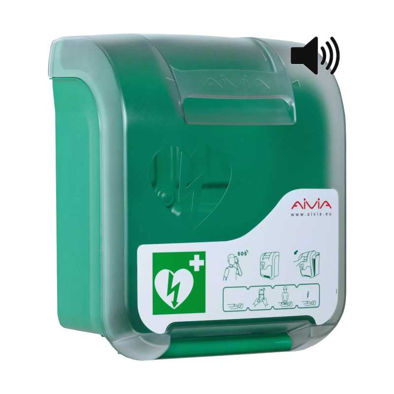 To praktyczne rozwiązanie do przechowywania AED, które zwiększa dostępność sprzętu i bezpieczeństwo dzięki funkcji alarmu dźwiękowego.