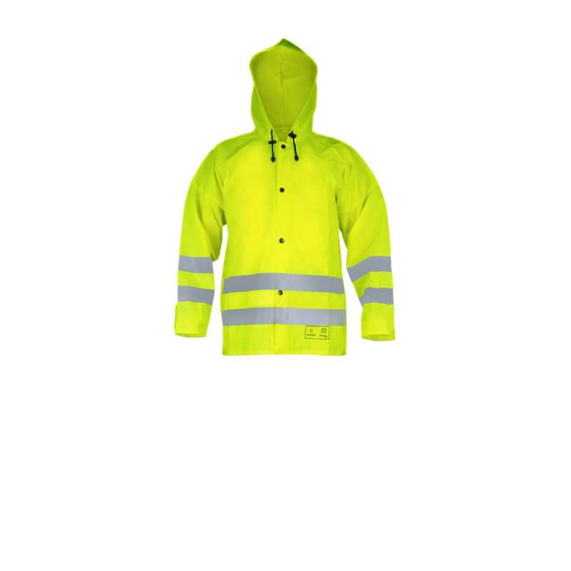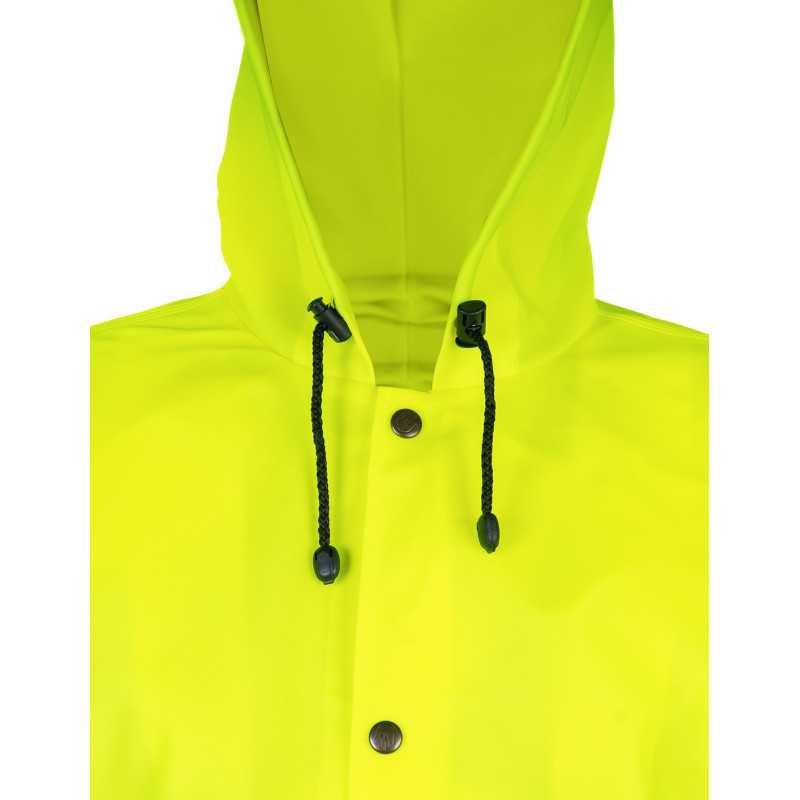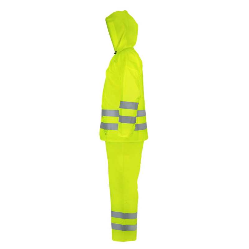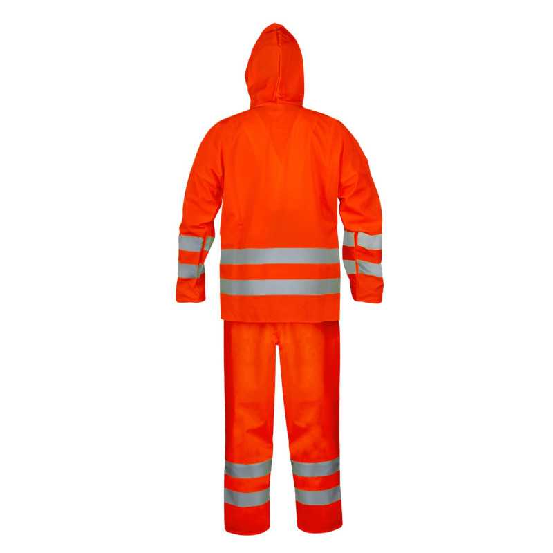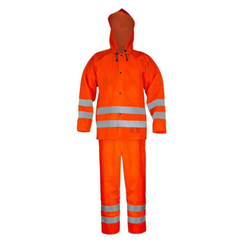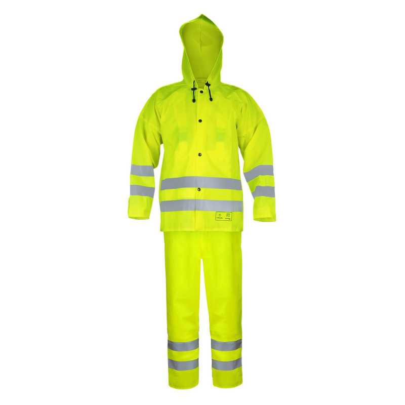 Komplet zapewnia wysoką widzialność i ochronę przed deszczem, sprawdzając się w pracach drogowych i budowlanych. Trwały materiał i funkcjonalna konstrukcja zwiększają bezpieczeństwo oraz komfort użytkowania.