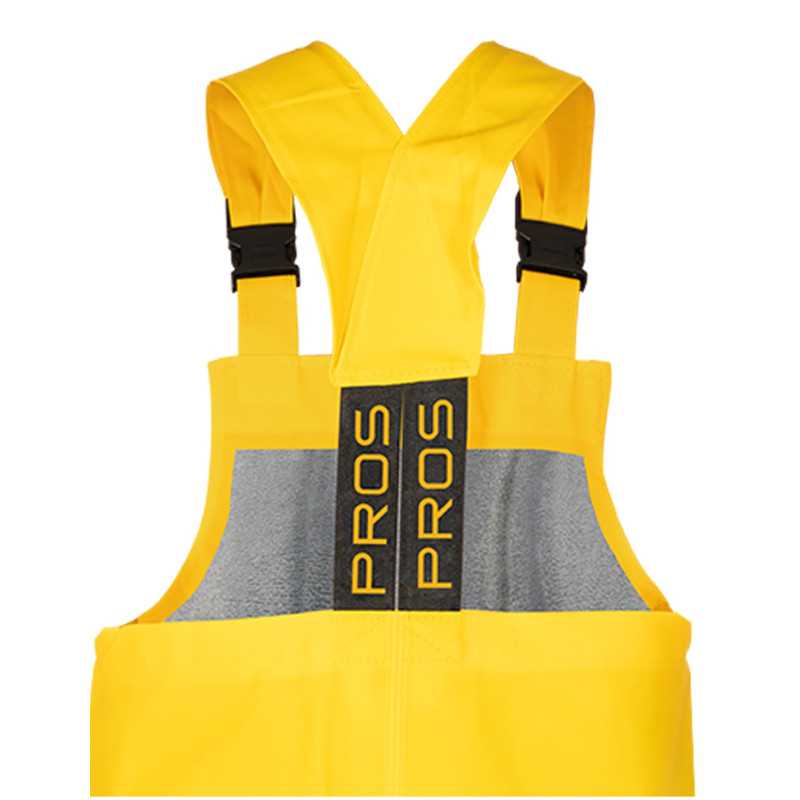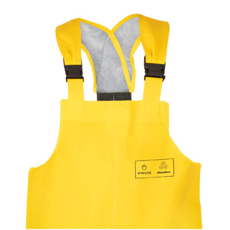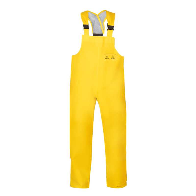 To podstawowy model odzieży ochronnej przeznaczonej do pracy w środowisku wilgotnym. Spodnie wykonane są z materiału powlekanego, który zapewnia nieprzemakalność oraz ochronę przed zabrudzeniami. Konstrukcja typu ogrodniczki umożliwia stabilne utrzymanie odzieży na ciele oraz zabezpiecza dodatkowo górną część nóg i tułów. Kluczową cechą jest skuteczna ochrona przed wodą przy zachowaniu prostoty i funkcjonalności.