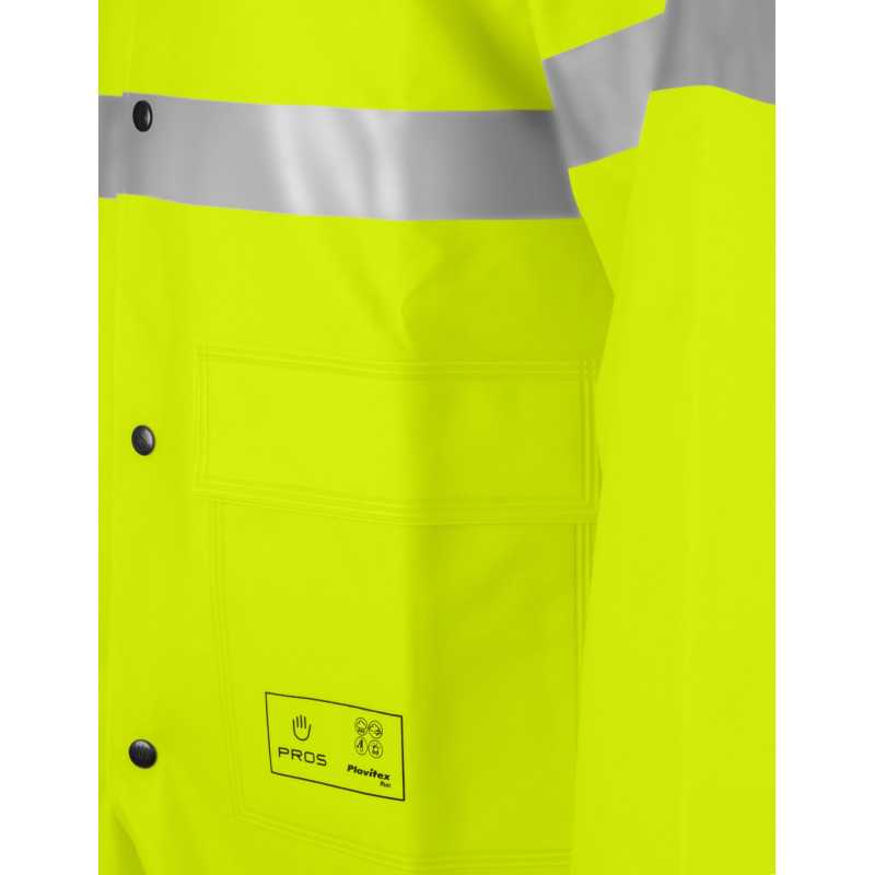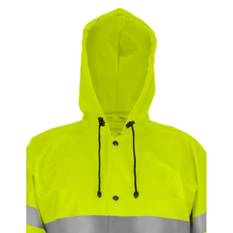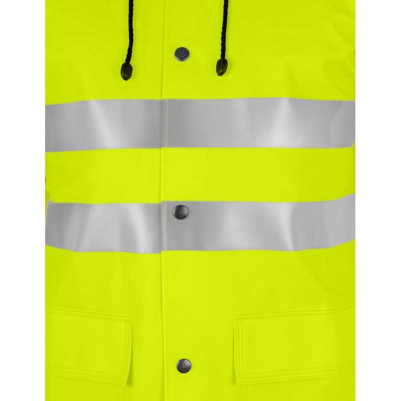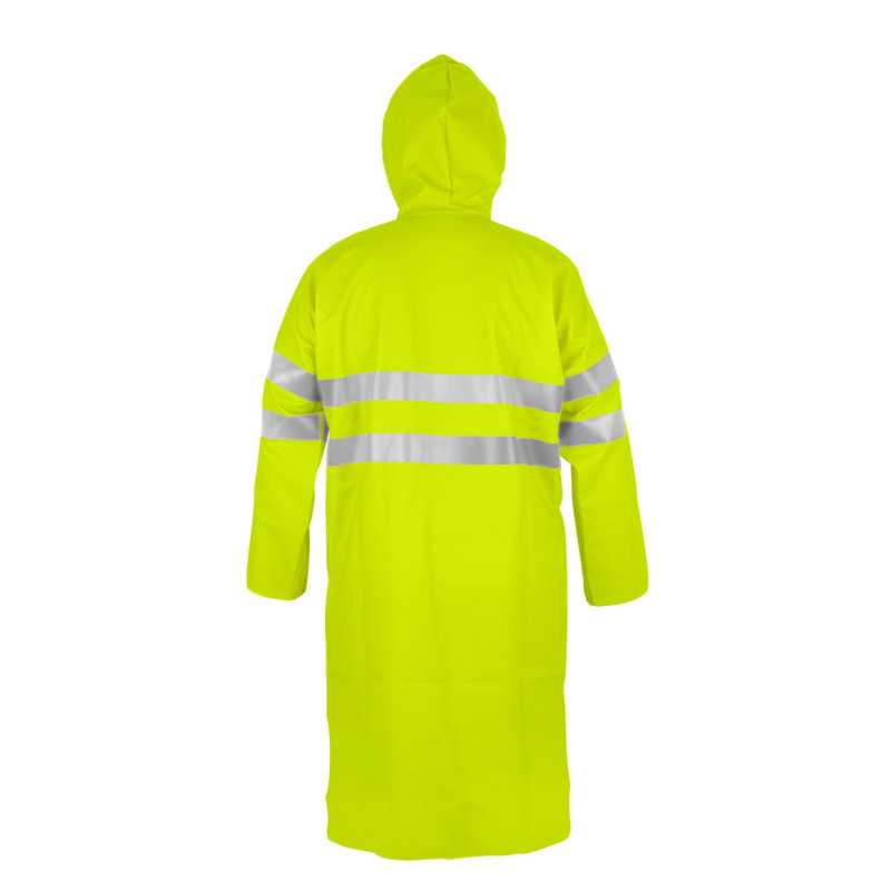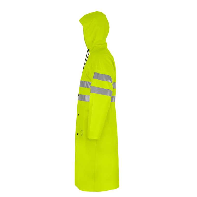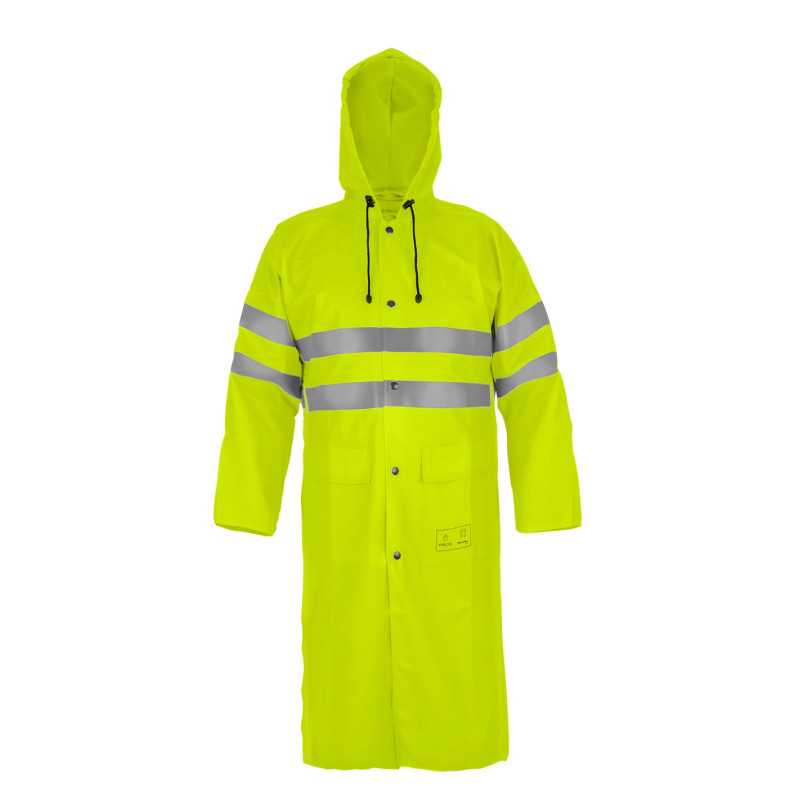 To specjalistyczna odzież ochronna typu hi-vis przeznaczona do pracy w warunkach deszczowych oraz ograniczonej widoczności. Płaszcz wykonany jest z materiału powlekanego, który zapewnia nieprzemakalność oraz ochronę przed zabrudzeniami. Długa forma zwiększa zakres ochrony ciała, a zastosowane elementy odblaskowe poprawiają widoczność użytkownika. Najważniejszą cechą jest połączenie wodoodporności z wysoką widzialnością.