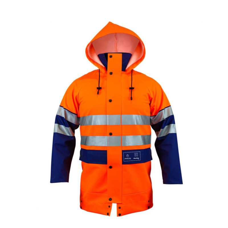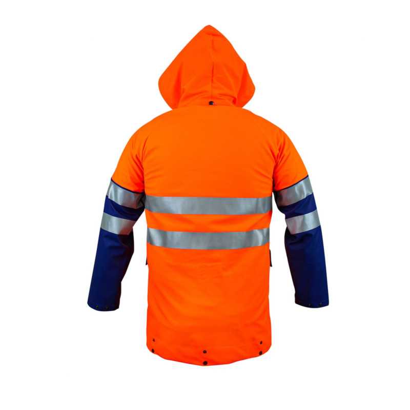 To specjalistyczna kurtka ochronna typu hi-vis zaprojektowana do pracy w warunkach wymagających dobrej widoczności oraz odporności na czynniki atmosferyczne. Dwukolorowa konstrukcja łączy intensywną barwę ostrzegawczą z ciemniejszymi elementami w miejscach narażonych na zabrudzenia. Wykonana z materiału o właściwościach ochronnych, zapewnia komfort użytkowania oraz trwałość. Najważniejszą cechą jest połączenie widzialności z praktyczną wytrzymałością.