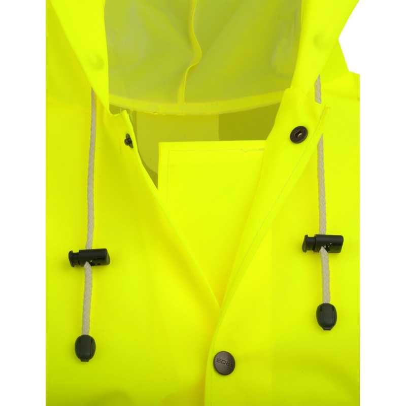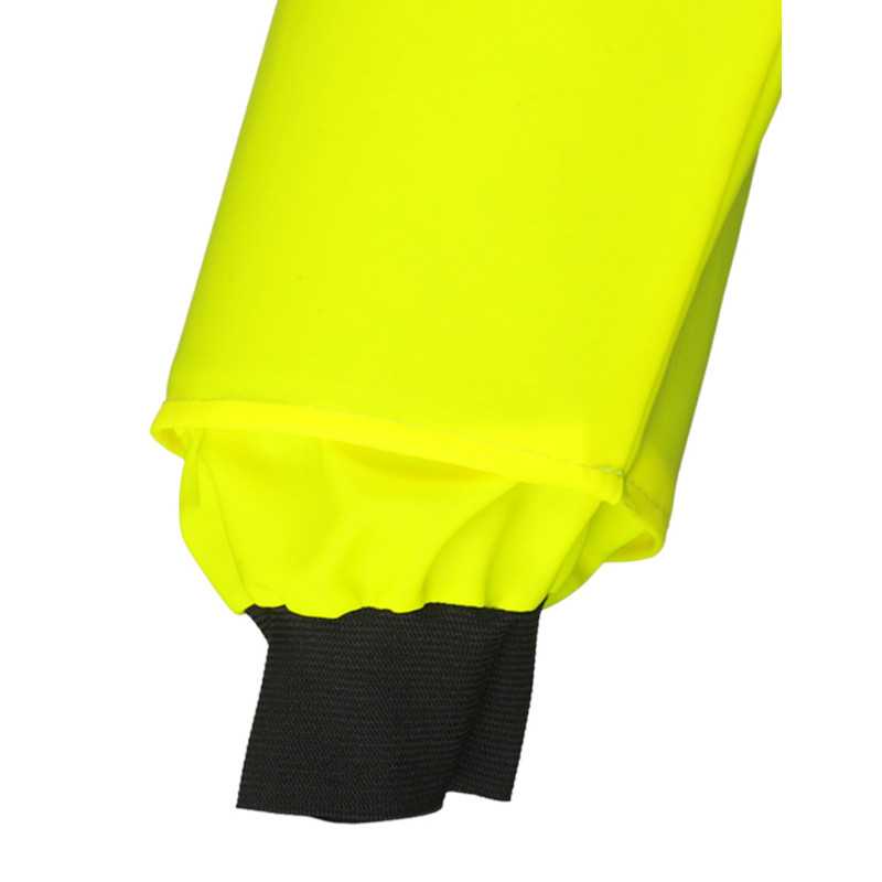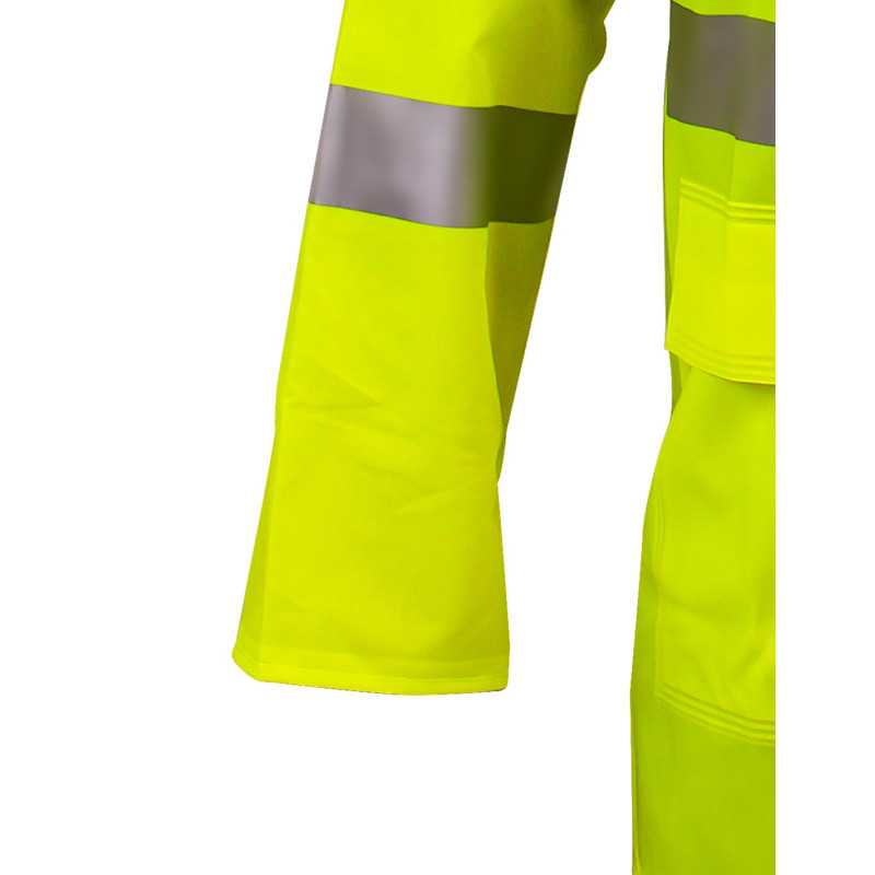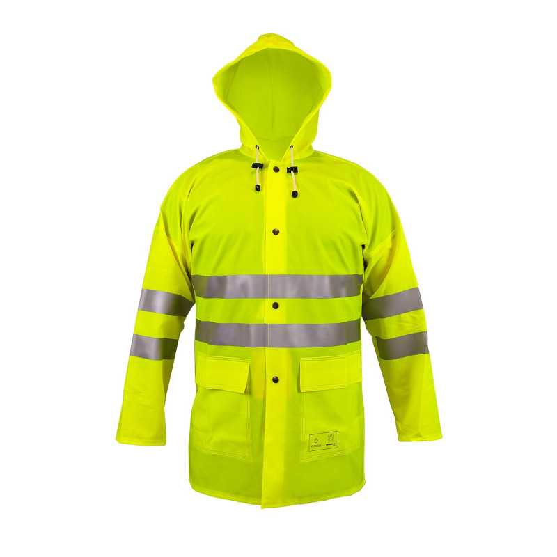 To specjalistyczna kurtka ochronna typu hi-vis przeznaczona do pracy w środowiskach wymagających zarówno ochrony przed opadami, jak i zwiększonej widoczności użytkownika. Wykonana z materiału powlekanego, zapewnia nieprzemakalność oraz odporność na działanie czynników atmosferycznych. Krój 3/4 chroni większą powierzchnię ciała, w tym biodra i górną część nóg. Najważniejszą cechą jest połączenie wodoodporności z wysoką widzialnością.