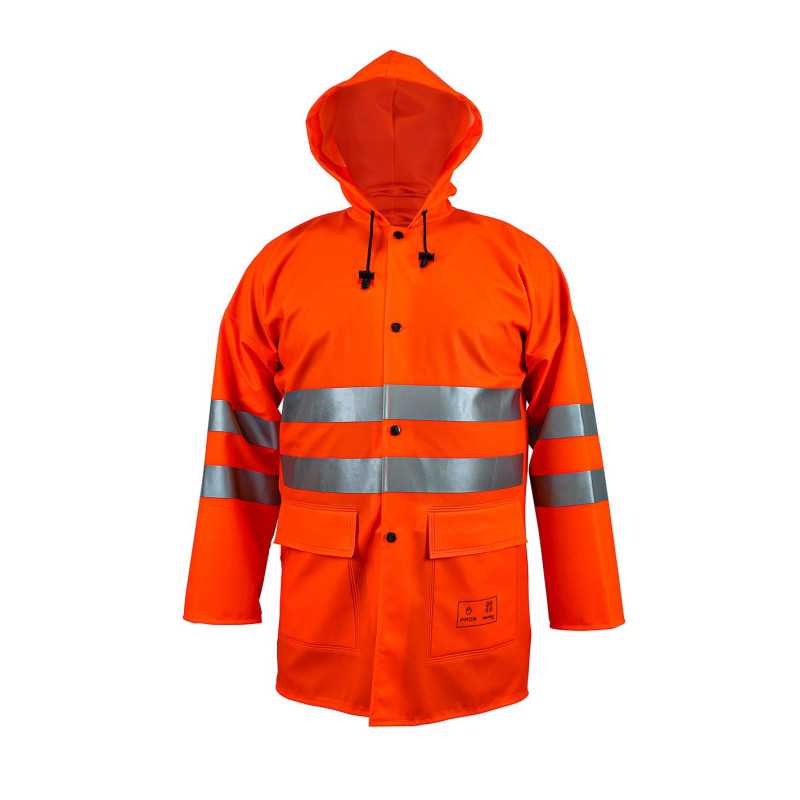 To specjalistyczna kurtka ochronna typu hi-vis przeznaczona do pracy w środowiskach wymagających zarówno ochrony przed opadami, jak i zwiększonej widoczności użytkownika. Wykonana z materiału powlekanego, zapewnia nieprzemakalność oraz odporność na działanie czynników atmosferycznych. Krój 3/4 chroni większą powierzchnię ciała, w tym biodra i górną część nóg. Najważniejszą cechą jest połączenie wodoodporności z wysoką widzialnością.