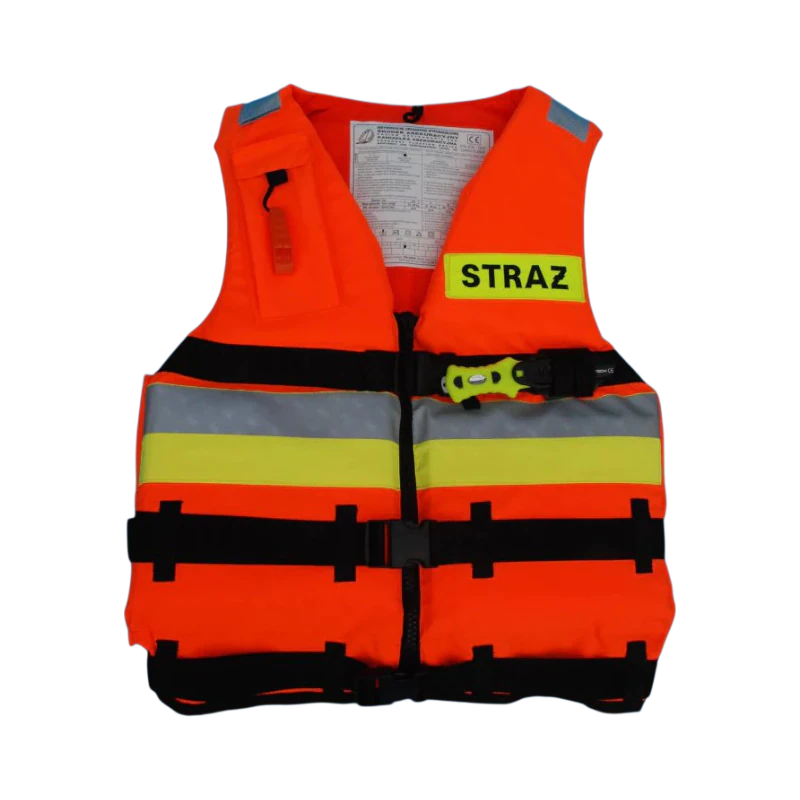 Kamizelka asekuracyjna specjalna model "STRAŻ" 80 N to certyfikowane wyposażenie osobiste przeznaczone dla strażaków uczestniczących w działaniach na akwenach. Zaprojektowana z myślą o ratownictwie wodnym w strukturach OSP i PSP, spełnia normy wyporności zgodne z wymaganiami dla środków asekuracyjnych. Kamizelka została stworzona w konstrukcji zapewniającej wygodę i bezpieczeństwo użytkownika. Jej charakterystyczny, czerwony kolor z napisem „STRAŻ” zwiększa rozpoznawalność, a zastosowane materiały i systemy regulacji pozwalają na szybkie dopasowanie i stabilne ułożenie na ciele. Jest to model dedykowany do wykorzystania w działaniach ratowniczych na wodzie, ćwiczeniach i zabezpieczeniu imprez w środowisku wodnym. Kamizelka dostępna jest w rozmiarach XL i XXL dla osób powyżej 70 kg.
