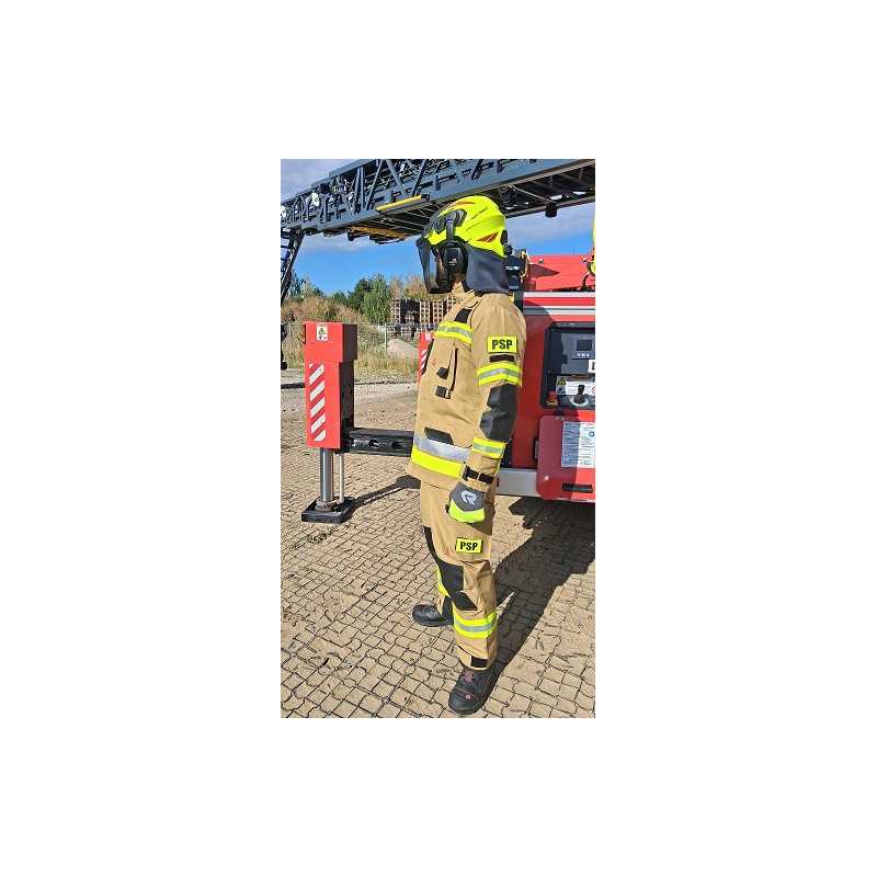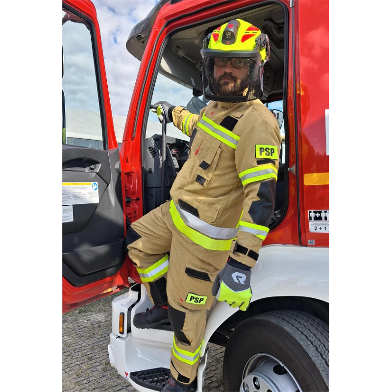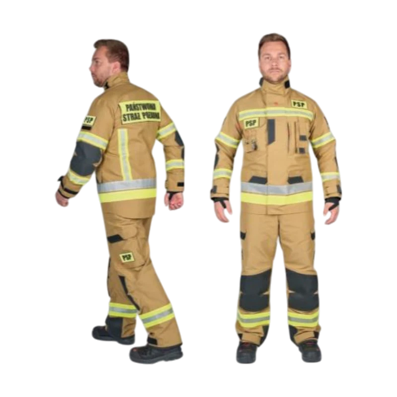 Lekki komplet ochronny dla strażaków, wykonany z tkaniny NOMEX® NXT, oferujący wysoką ochronę termiczną i oddychalność. W zestawie: kurtka i spodnie z certyfikatem CNBOP, w kolorze piaskowym.