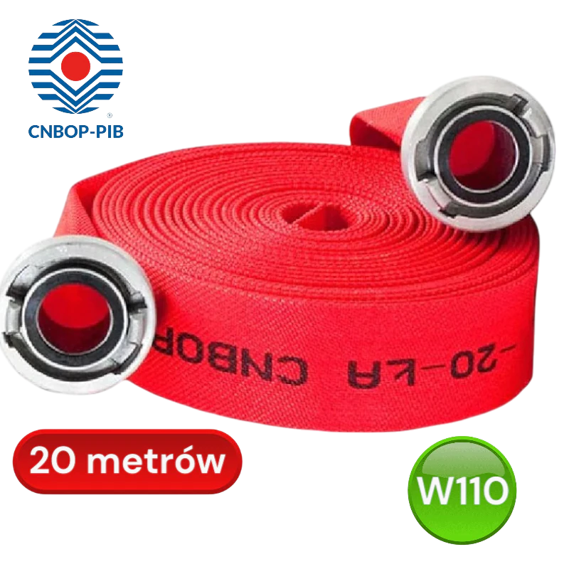 Powlekany wąż tłoczny W 110-20 z wkładką poliuretanową, przeznaczony do transportu wody pod wysokim ciśnieniem. Certyfikowany przez CNBOP, odporny na ścieranie i czynniki atmosferyczne. Powłoka zewnętrzna zapewnia dodatkową ochronę i zwiększa trwałość w trudnych warunkach.