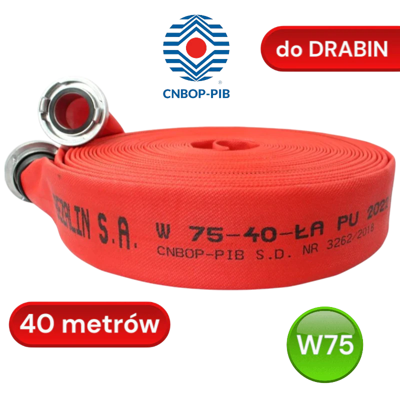 Powlekany wąż tłoczny W 75-40 o długości 40 metrów, przeznaczony do drabin pożarniczych i podawania wody na wysokość. Wykonany z poliuretanu, odporny na ścieranie i wysokie ciśnienie. Certyfikowany przez CNBOP, zapewnia trwałość i niezawodność w wymagających warunkach.