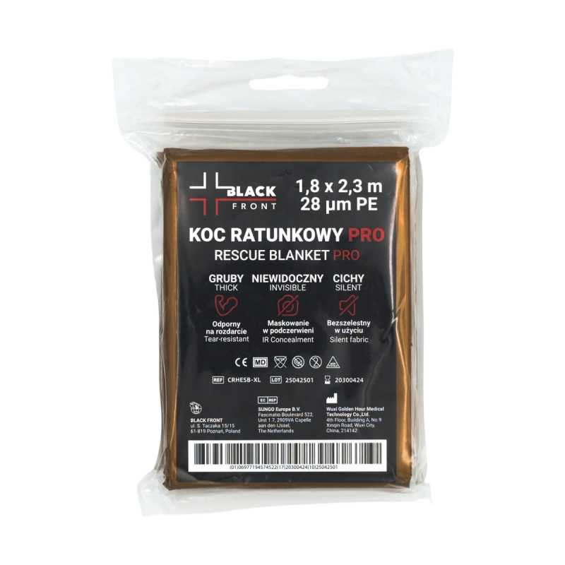 Koc ratunkowy Black Front PRO to profesjonalne wyposażenie ratownicze, przeznaczone do natychmiastowej ochrony termicznej osób poszkodowanych w różnych sytuacjach kryzysowych. Produkt wykonano z trwałej folii metalizowanej PET o wysokiej odporności na rozdarcia i przetarcia, przy jednoczesnym zachowaniu niewielkiej wagi i kompaktowych wymiarów po złożeniu. Koc ma standardowy rozmiar 160 × 210 cm, co umożliwia pełne okrycie dorosłej osoby. Wyposażony jest w dwie strony o różnych kolorach – złotą i srebrną – co pozwala dostosować jego użycie w zależności od potrzeb: ochrony przed wychłodzeniem lub przegrzaniem. Seria PRO dedykowana jest służbom ratowniczym, takim jak straż pożarna, ZRM czy OSP, a także znajduje zastosowanie w zestawach R1, apteczkach i torbach medycznych. Koc Black Front PRO wyróżnia się wysoką jakością wykonania i wytrzymałością, odpowiadając na potrzeby użytkowników pracujących w wymagających warunkach terenowych i atmosferycznych.