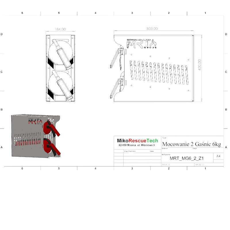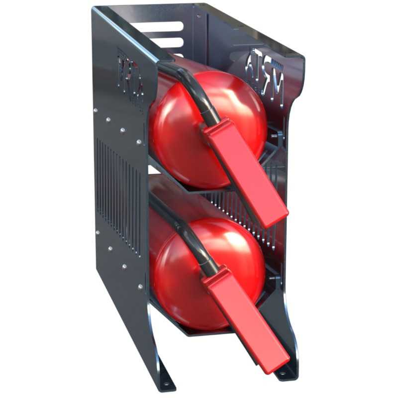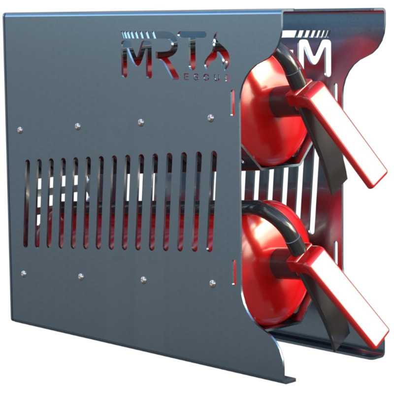 MRTM1002 to funkcjonalne, odporne mocowanie umożliwiające stabilny i uporządkowany transport dwóch gaśnic 6kg w pojazdach oraz magazynach jednostek strażackich.