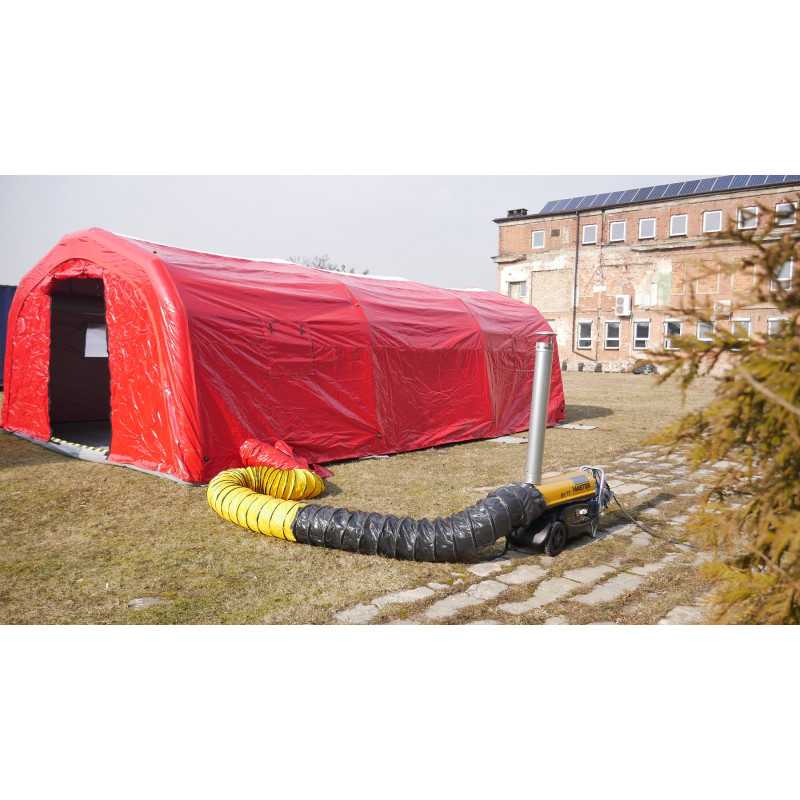 Namiot pneumatyczny do zastosowań ratowniczych, z powiększoną powierzchnią roboczą, pompowanym stelażem i kompletem wyposażenia. W zestawie: namiot V30, pompka, torba transportowa, linki mocujące, zestaw naprawczy.
