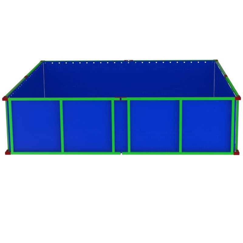 Wykonany z trwałej powłoki PVC odpornej na promieniowanie UV i uszkodzenia mechaniczne oraz stalowej ramy malowanej proszkowo, zapewnia stabilność i niezawodne użytkowanie w trudnym terenie.