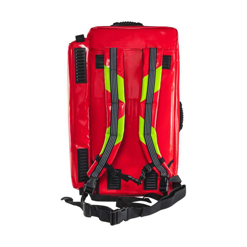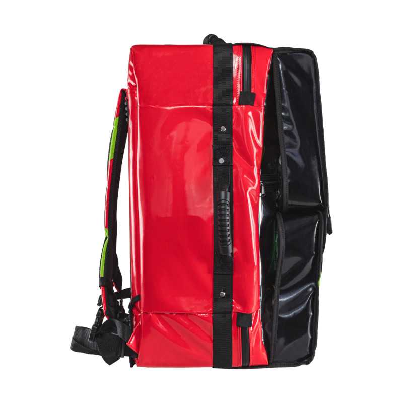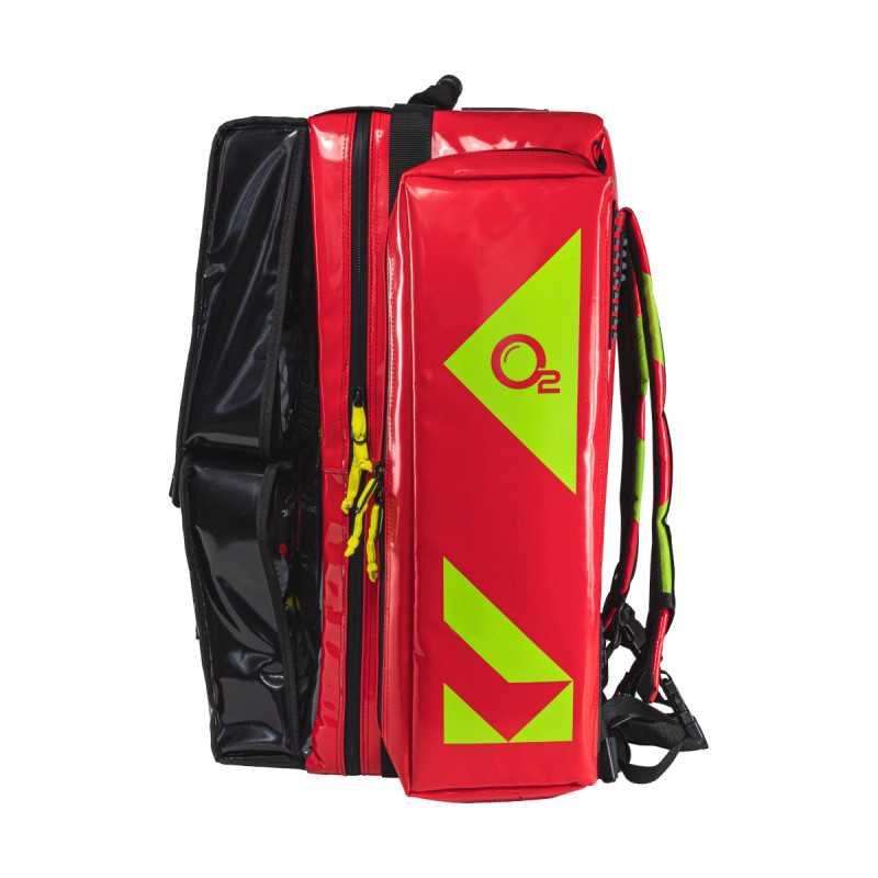 --> komora główna: zawiera miejsce na butlę tlenową, ssak ręczny, kołnierze ortopedyczne zabezpieczone mocowaniem typu shock cord oraz dwie saszetki modułowe z produktami do tlenoterapii czynnej (pediatryczna i dla osób dorosłych). Druga części komory głównej posiada miejsce na 4 saszetki segregacyjne oraz ukrytą kieszeń na torbę z zestawem opatrunków hydrożelowych, którą można wyciągnąć za żółte ucho od dołu lub góry