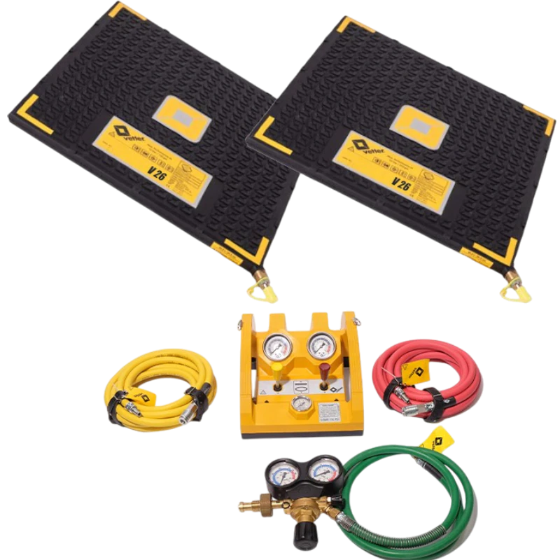 Zestaw poduszek wysokociśnieniowych Vetter - Zestaw I - 12 bar Basic zapewnia skuteczne i bezpieczne podnoszenie ciężkich obiektów do 20,2 ton na poduszkę. Zawiera dwie poduszki, reduktor butlowy, sterownik podwójny oraz węże napełniające, co czyni go idealnym rozwiązaniem w akcjach ratowniczych.